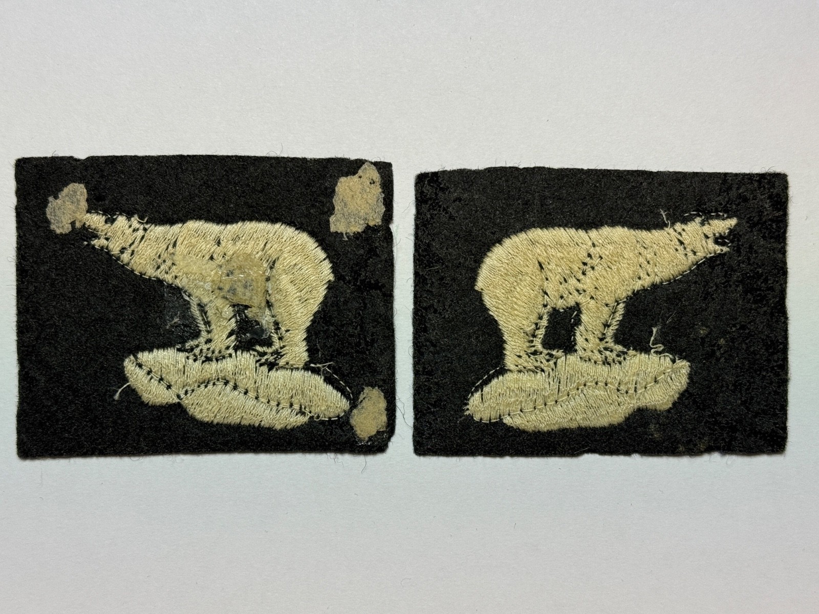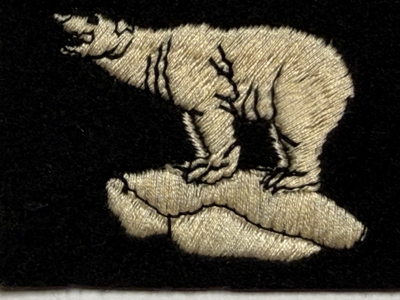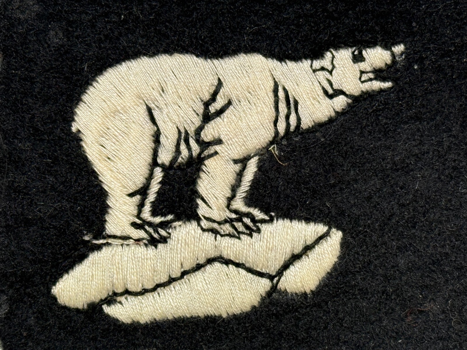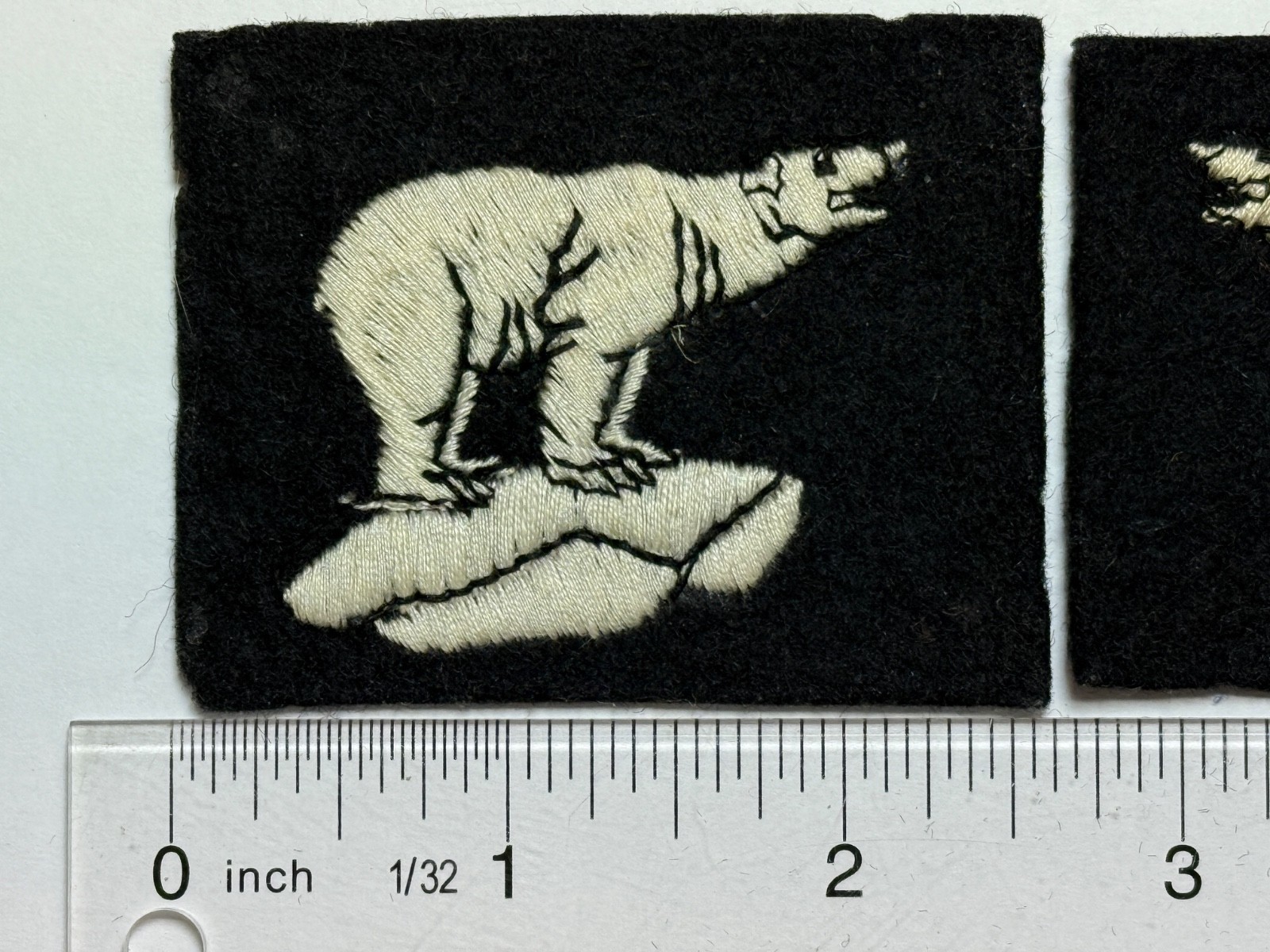 This is the third version of the Polar Bear patches. Cotton embroidery on black wool base. Displays honest age and does not react to ultra violet light, nice original Polar Bear Patches. These were removed from a collectors display board.