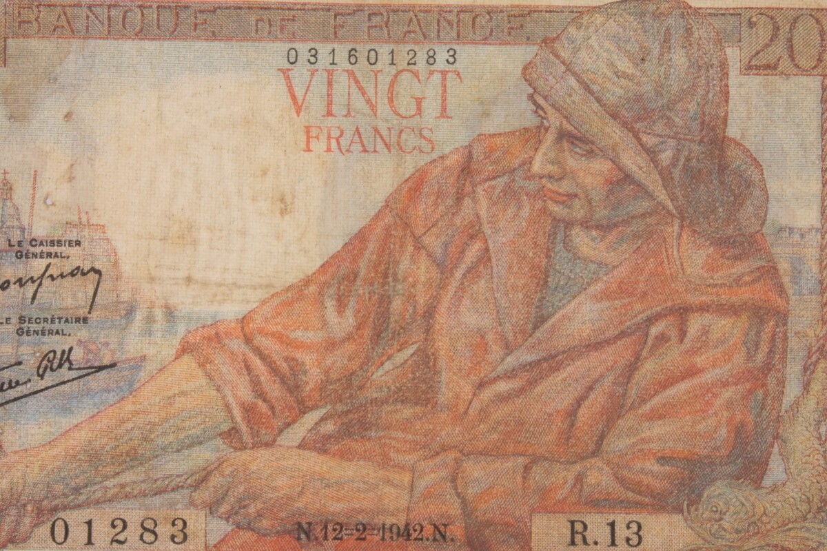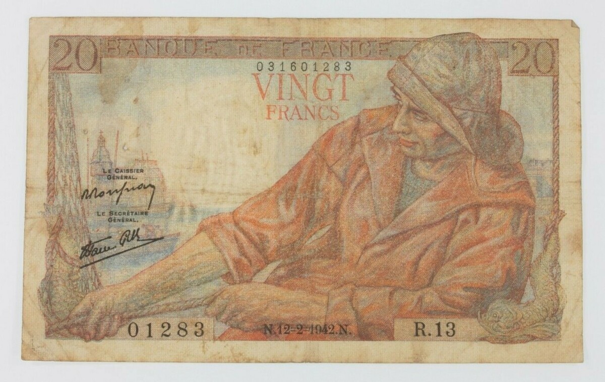 - 1942 France 20 Francs "Pecheur" (Fisherman) Fine condition Pick#100a