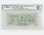 Scelle dans un support PMG avec le titre "NOUVEAU HEBRIDES / Numero d'urgence - WWII // Pick # 1 nd (1943) 5 Franc // S / N 01673 - Services Nationaux Francais"