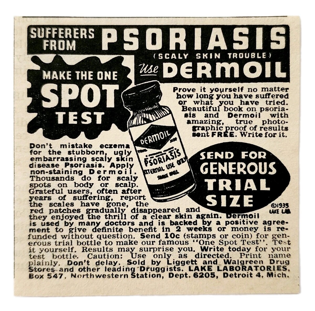 1944 Lake Labs Dermoil Psoriasis Lotion Advertisement Skin Care Medicine F8A