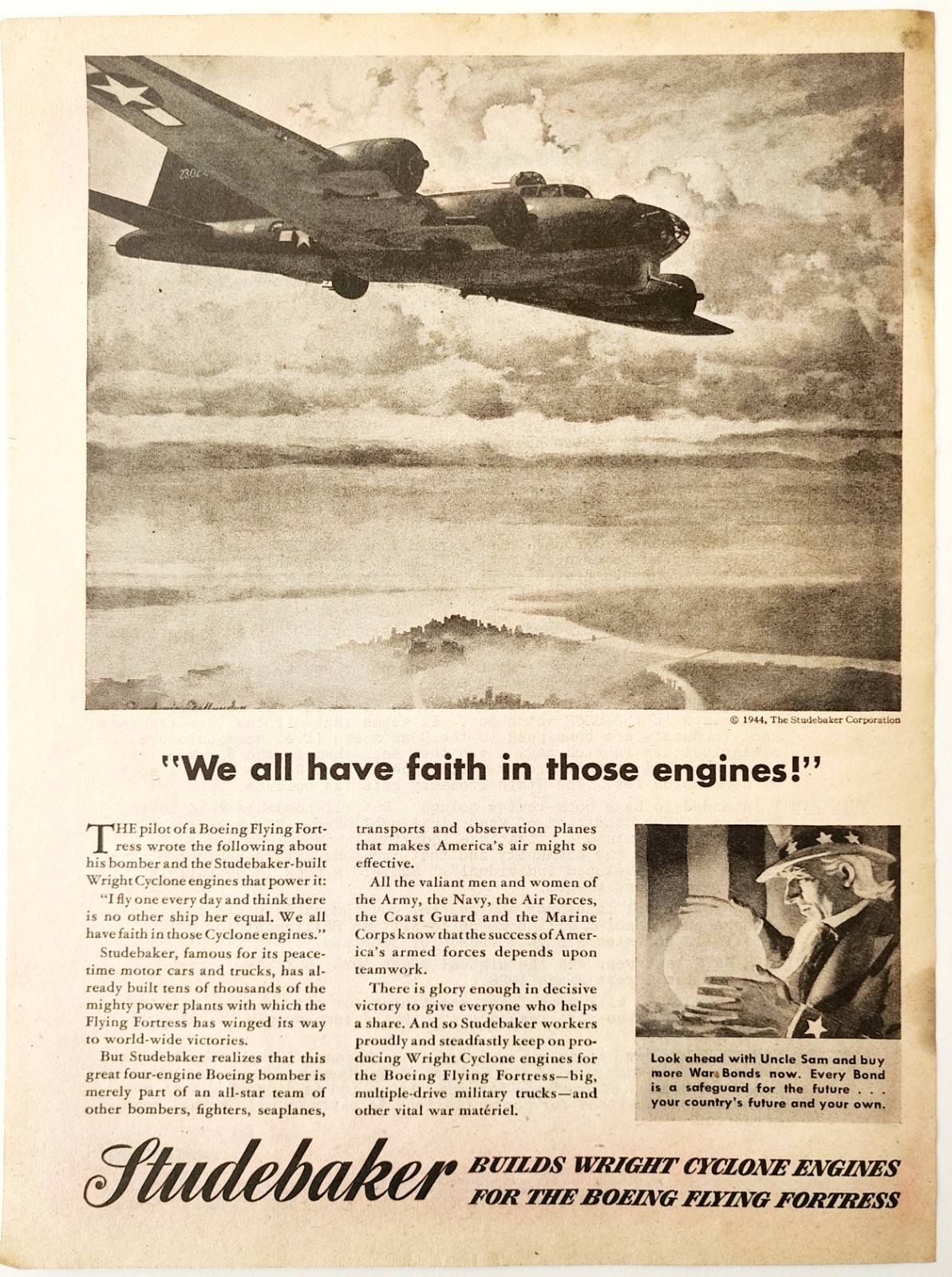 1944 Studebaker Boeing Flying Fortress Advertisement WW2 Era Aviation DWP7A
