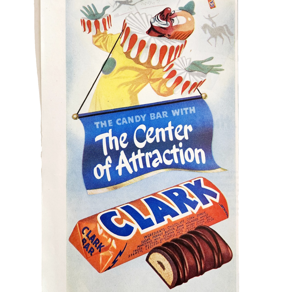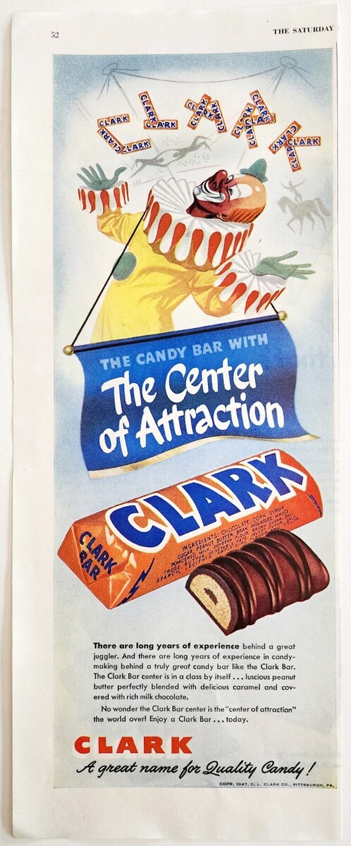 1947 Clark Candy Bar Advertisement Circus Clown Attraction Snack DWJJ20