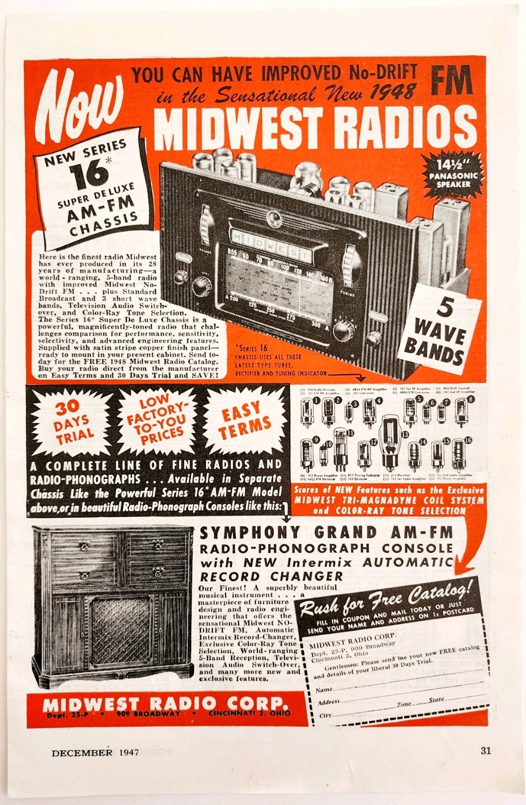 Primary image for 1947 Midwest Radios Model 16 Super DeLuxe Advertisement Vintage Electronics E8D