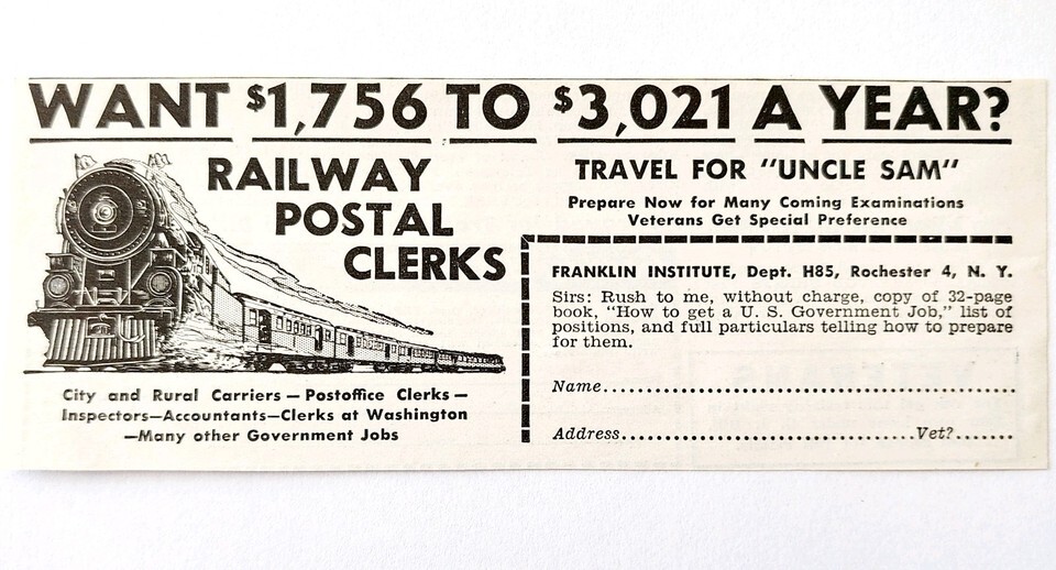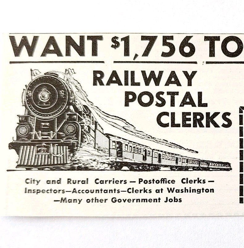 1947 Railway Postal Clerk Advertisement Vintage Trains Railroad Job E8K