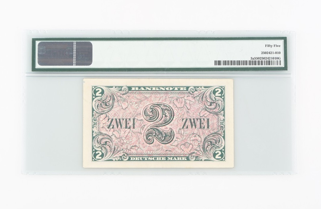 Scelle dans un support PMG avec le titre "Allemagne - Republique federale // PICK # 3A 1948 2 Deutsche Mark // S / N A06516444B Bloc 45 - Allied Occupation - Post WWII"