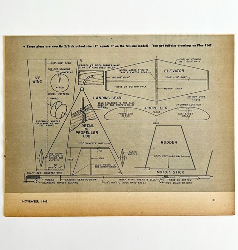 Primary image for 1949 Aviation Blueprint Build Pattern Model Airplane Ephemera Art Print 2/3rds