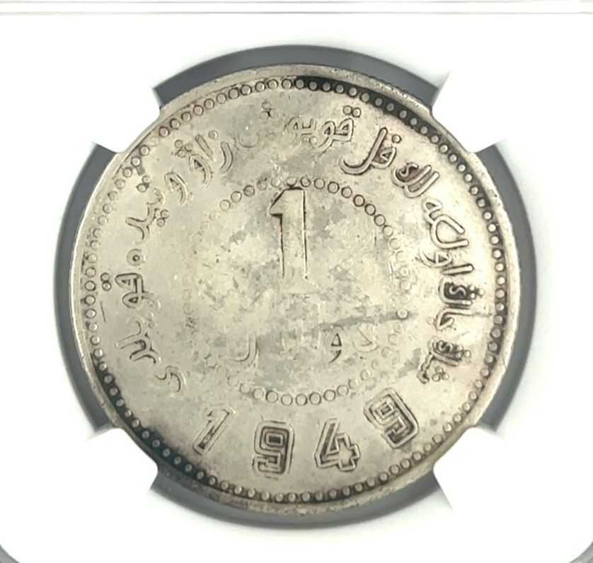 1949 China S$1 Dolar Sinkiang L M-842 Base Puntiaguda 1 por NGC como DETALLES XF
