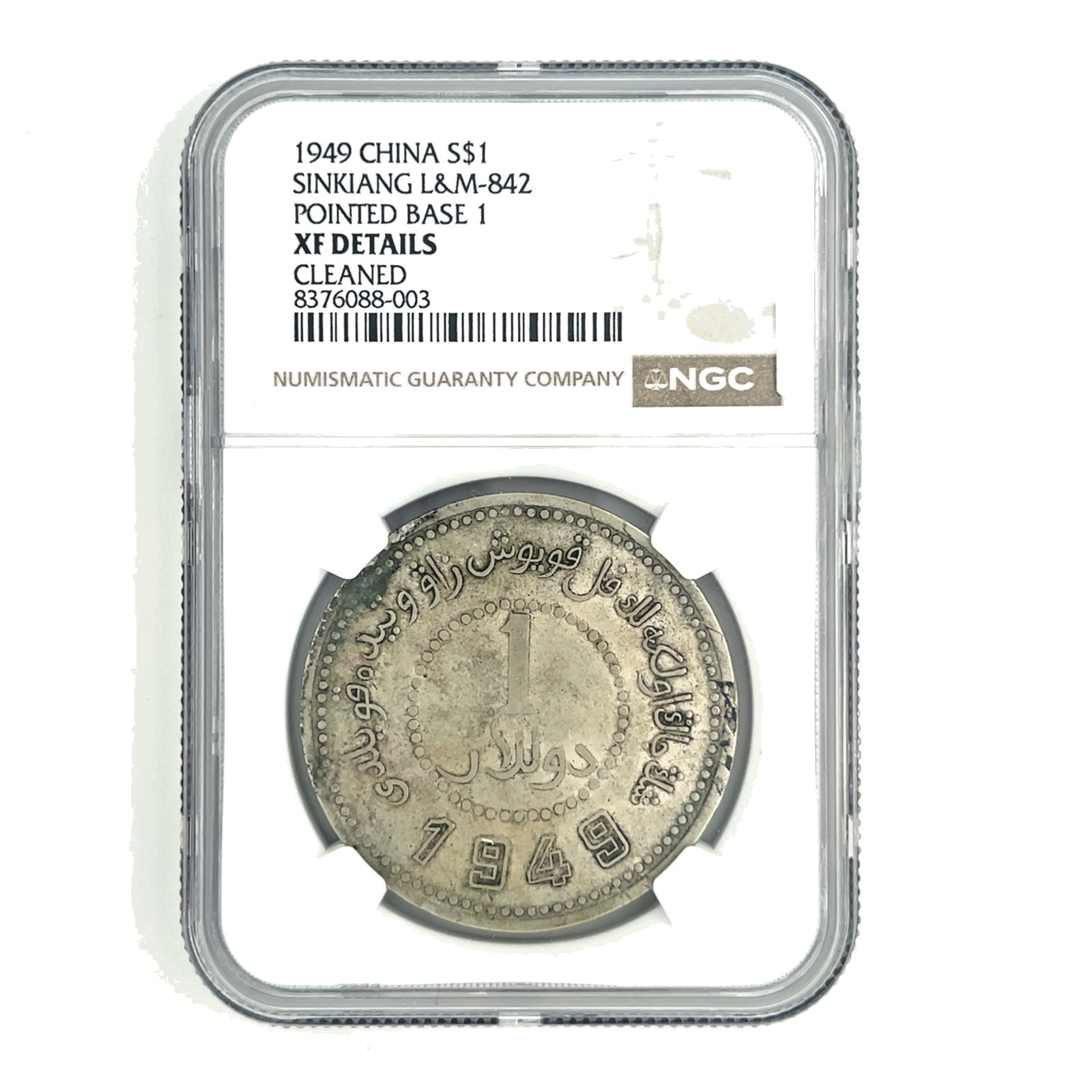 - 1949 China S$1 Dólar Sinkiang L&M-842 Puntiagudo Base 1 por NGC como DETALLES XF