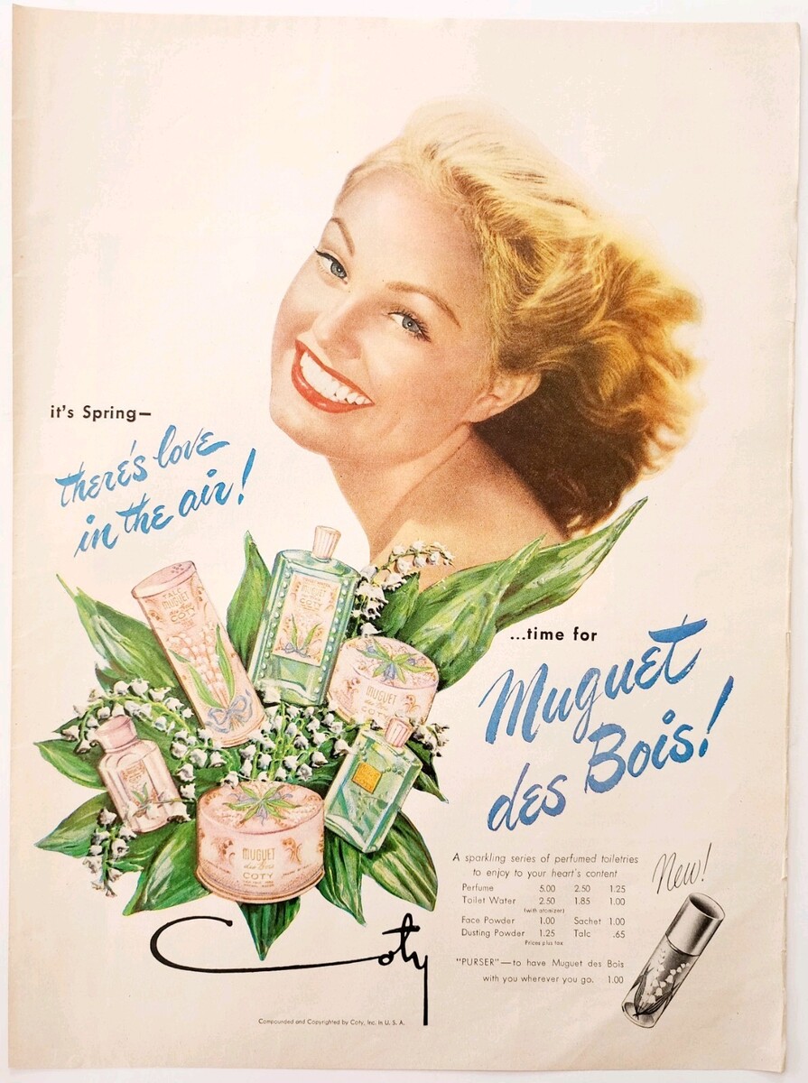 1950 Coty Muguet Des Bois Perfume & Powder Advertisement Beauty Products DWJJ9