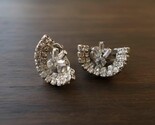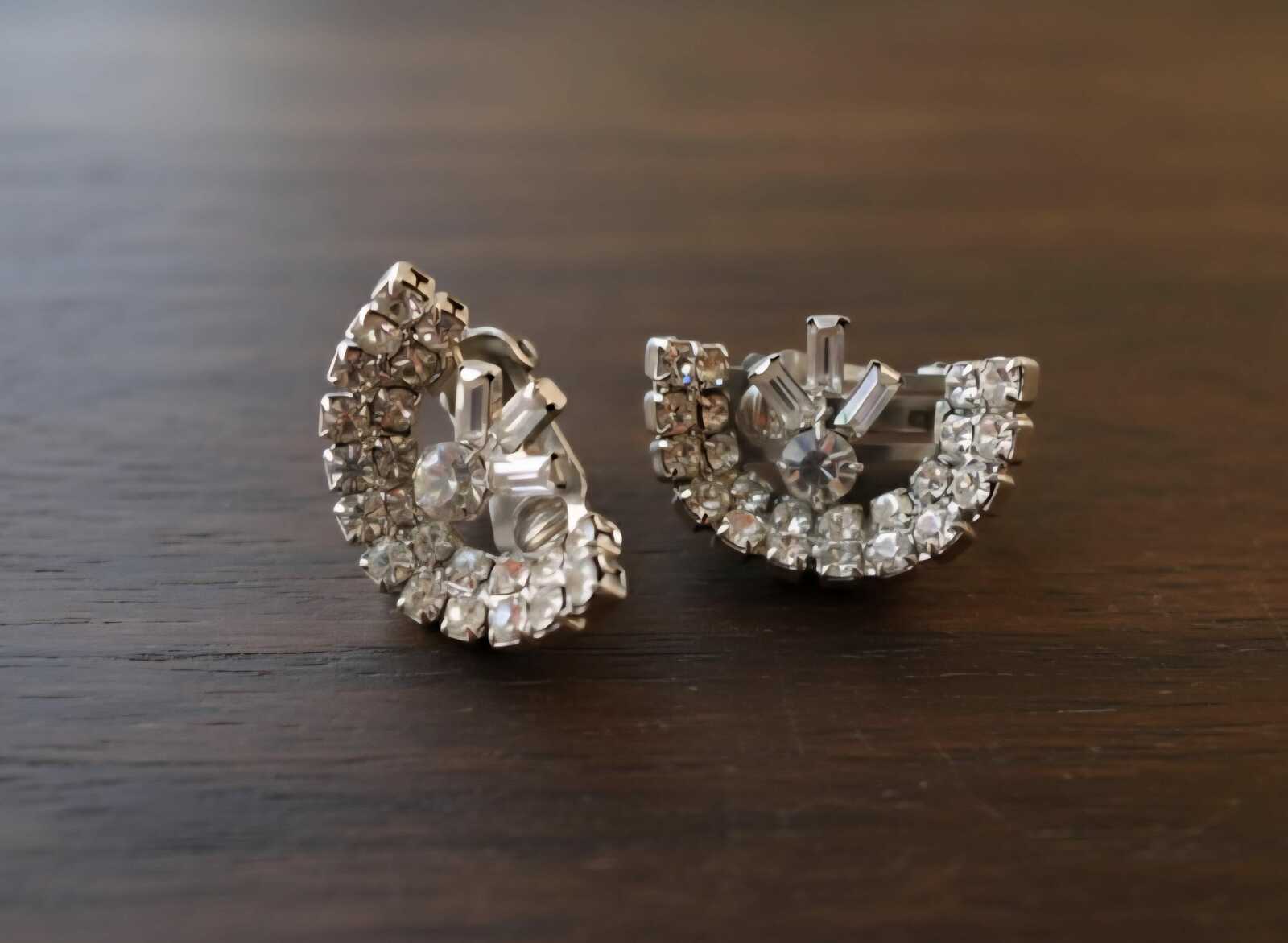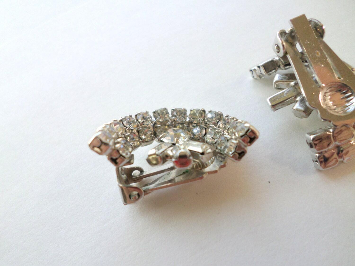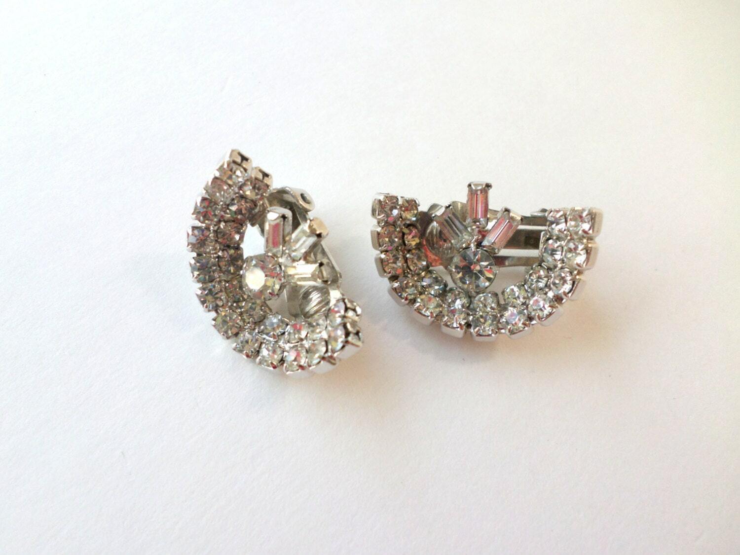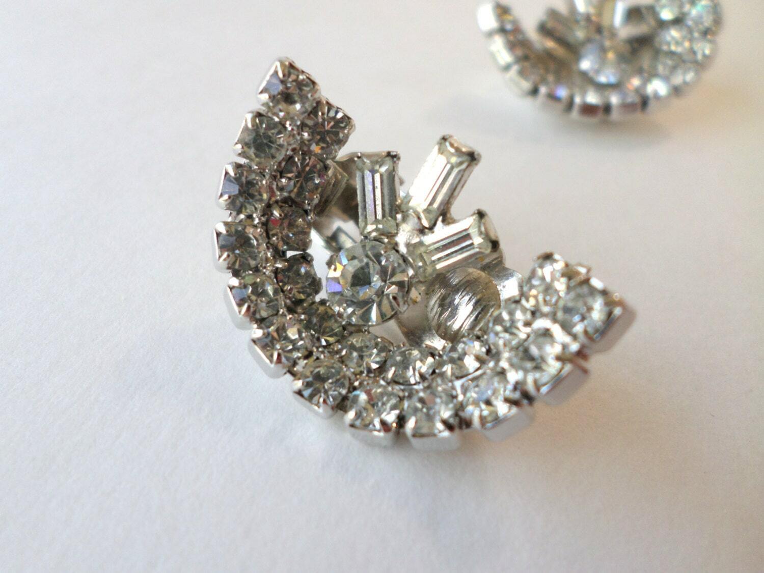 - 1950s Crescent Moon Earrings, Clear Rhinestone Mid Century Clips