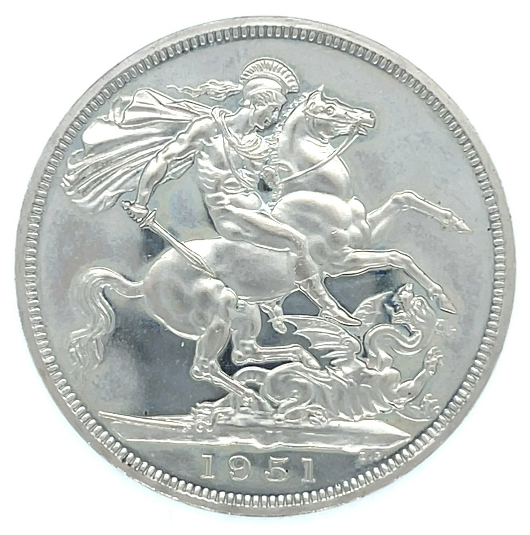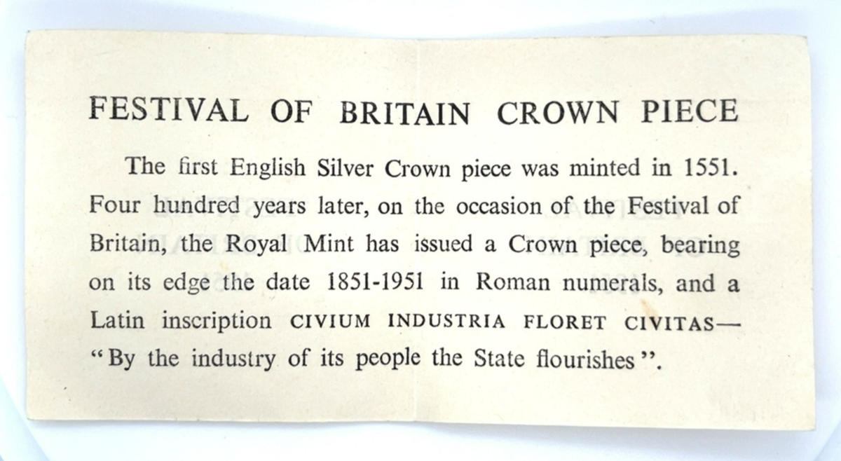 Zum Gedenken an die erste Silberkrone, die 1551 gepragt wurde. 400 Jahre spater, beim Festival of Britain, gab die Royal Minted diese Krone/5-Schilling-Münze heraus