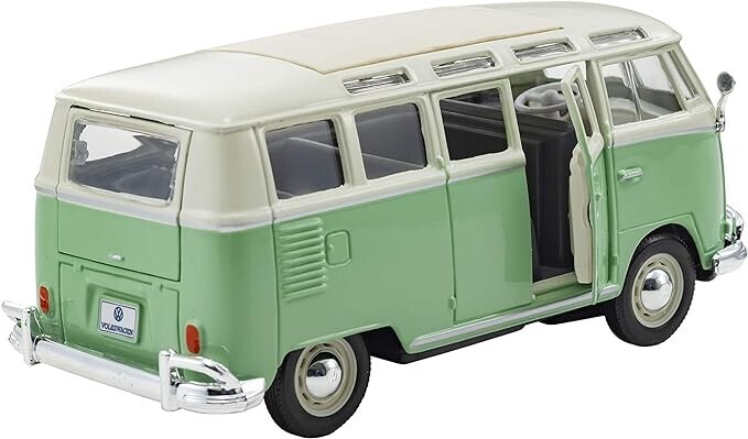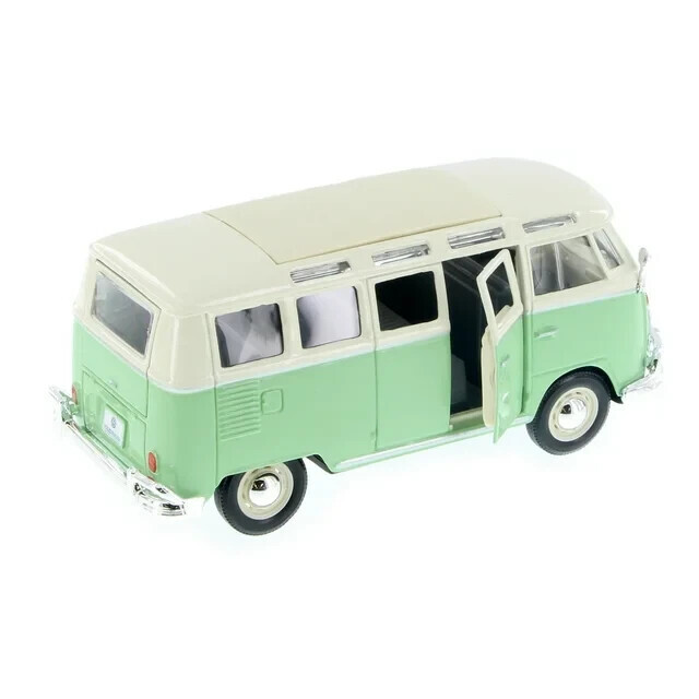 This 1951 VW T1 Type-2 Samba Bus measures 7" long, 3" wide and 3" high. It has openable tailgate and passenger side doors. The seats/benches inside are visible and molded quite accurately. Hub cabs have the VW logo embossed and the tires are made of rubber. The headlights, side view mirrors and bumpers add nice and realistic details. This model ships in a window box. The Volkswagen Type 2, known officially (depending on body type) as the Transporter, Kombior Microbus, or, informally, as the Bus (US) or Camper (UK), is a panel van introduced in 1950 by the German automaker Volkswagen as its second car model. Following - and initially deriving from Volkswagen's first model, the Type 1 (Beetle) - it was given the factory designation Type 2. The Volkswagen "Samba", officially the Kleinbus Sonderausfรผhrung (small bus, special version) and marketed as the Microbus Deluxe and Sunroof Deluxe in the United States, was the most luxurious version of the T1. Volkswagen started producing Sambas in 1951; in 1952 the name in the home market was changed to Sondermodell (special model). the precise origin of the Samba nickname is unclear: sources refer to "samba cars", special train cars for dancing used by the Bundesbahn in the 1950s, while others suggest that it is an abbreviation for either Sonder-Ausfรผhrung mit besonderer Ausstattung (special version with special equipment) or for Sonnendach-Ausfรผhrung mit besonderem Armaturenbrett (sunroof version with special dashboard). The Samba name first appeared in official literature in Dutch price lists.