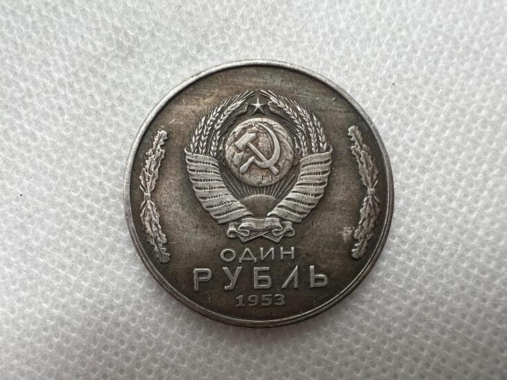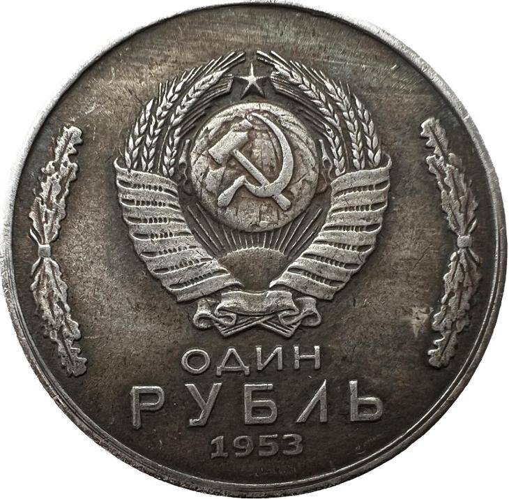 Die Rückseite ist eine Hommage an traditionelle sowjetische Symbole, wobei der ikonische Hammer und die Sichel im Mittelpunkt stehen, umgeben von Weizengarben, die die Einheit von Arbeiterklasse und Bauernschaft veranschaulichen. Die Inschrift "???? ?????" (ein Rubel) bezeichnet zusammen mit dem Datum von 1953 sowohl die Bezeichnung der Medaille als auch das bedeutende Pragejahr, ein Jahr, das durch den Tod Joseph Stalins und die nachfolgenden politischen und wirtschaftlichen Veranderungen innerhalb der Sowjetunion gekennzeichnet war. Diese Nachpragung zeigt nicht nur die technischen und ideologischen Fortschritte der Epoche, sondern dient auch als wichtiges kulturelles Artefakt aus dieser entscheidenden Zeit der Geschichte.