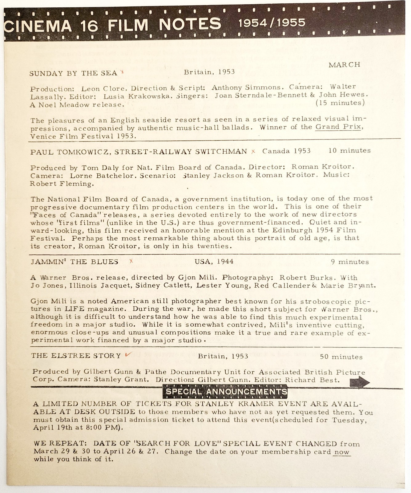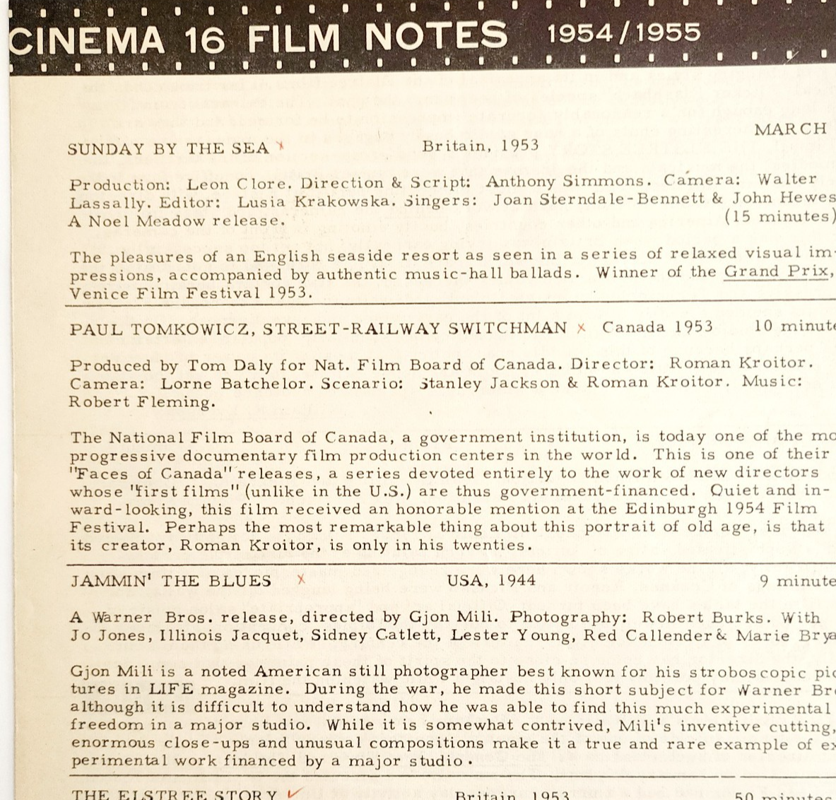 - 1955 Cinema 16 Film Notes Sunday By The Sea Railway Switchman Original NYC C99