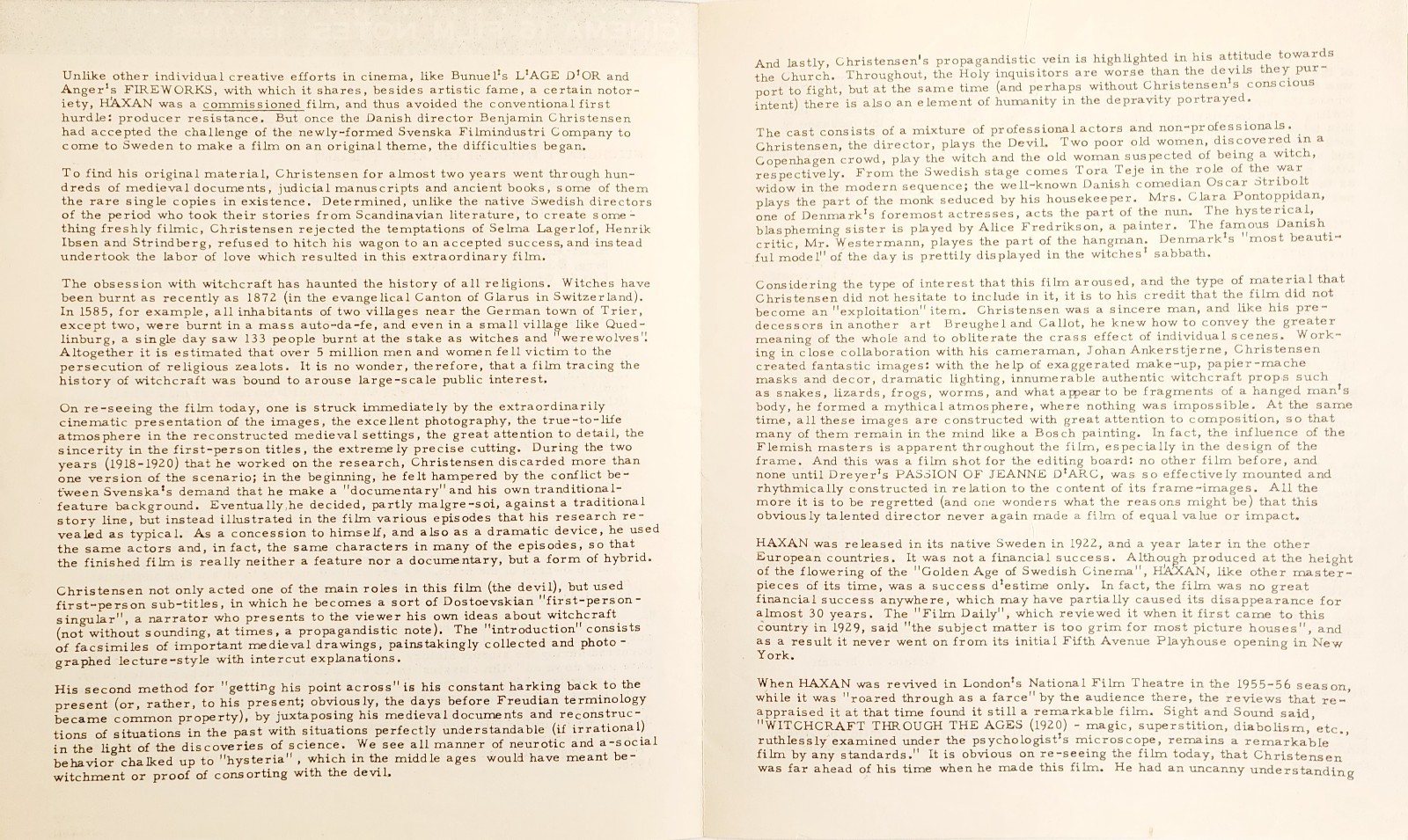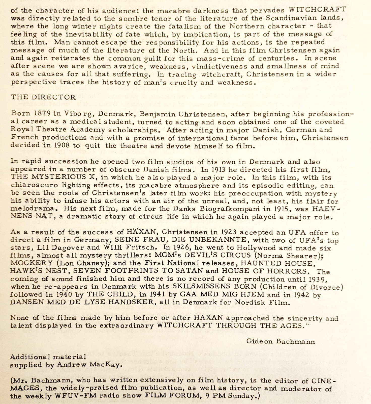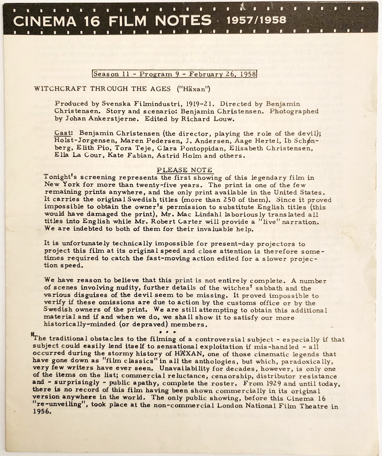 - 1955 Cinema 16 Film Notes Witchcraft Through The Ages Christensen Original C99