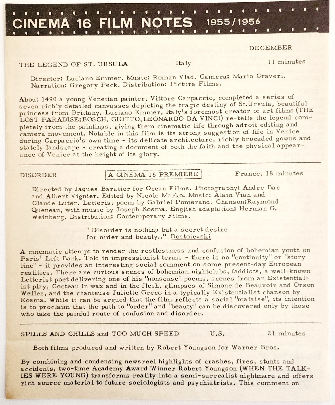 - 1956 Cinema 16 Film Notes Ursula Disorder Baratier Spills & Chills Original C99