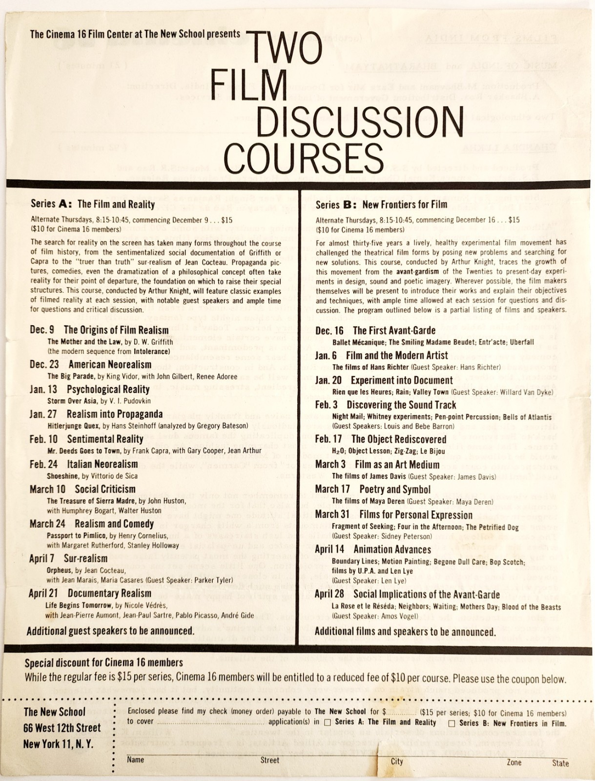- 1957 Cinema 16 Film Discussion Course Sign Up Form Original New School NYC C99