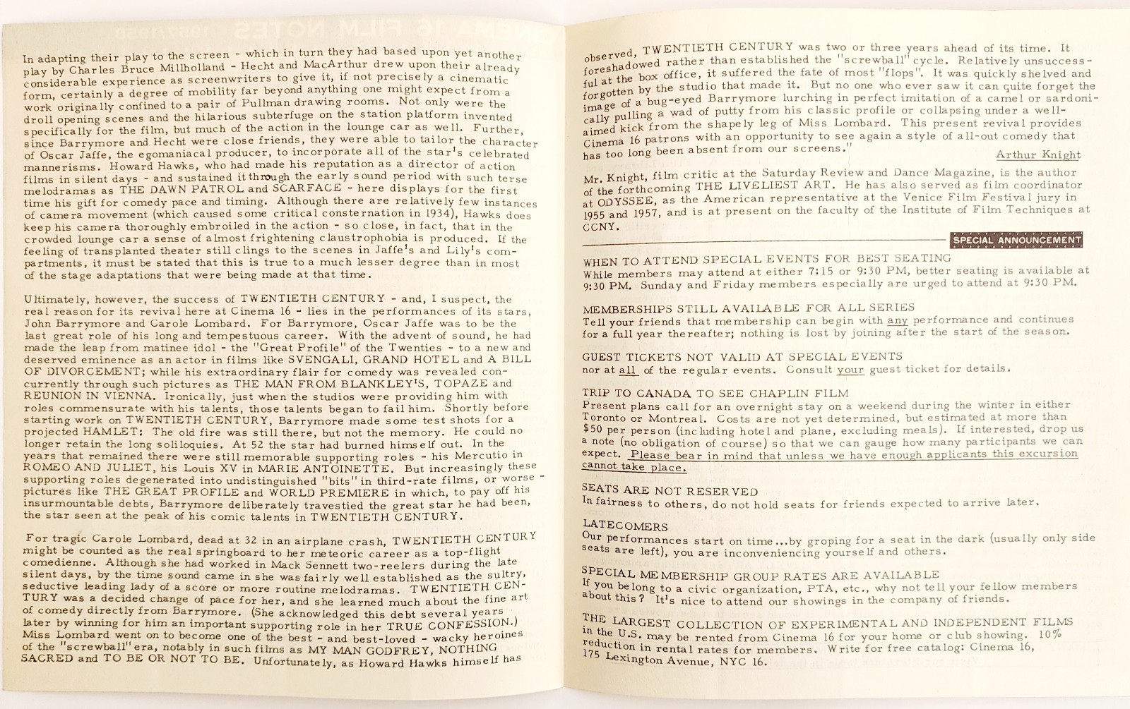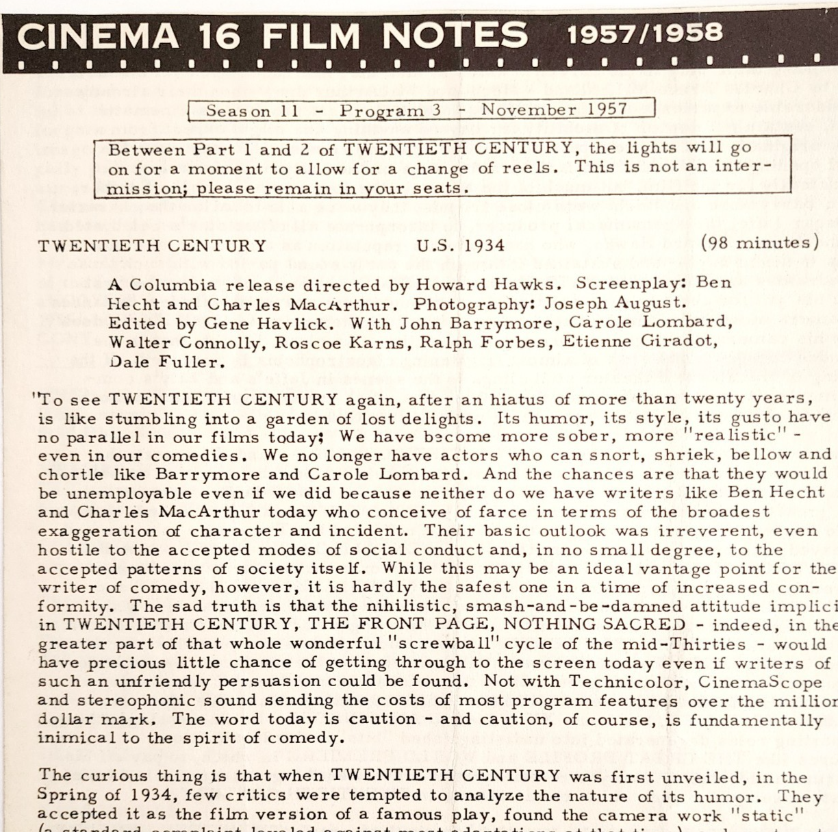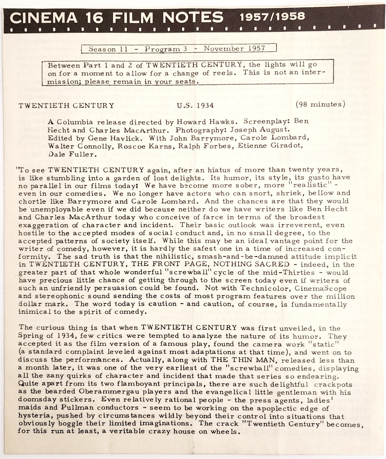 - 1957 Cinema 16 Film Notes Twentieth Century Hawks Season 11 Nov Original 2 C99