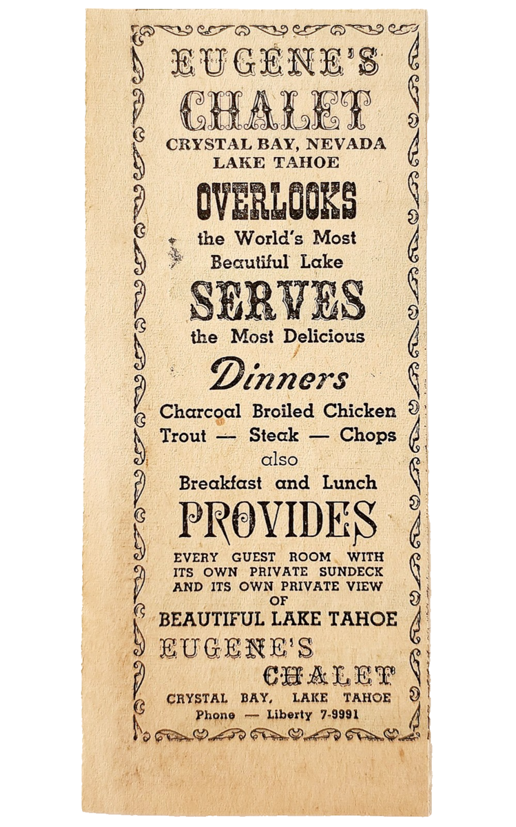 1957 Eugene's Chalet Restaurant Advertisement Vintage Lake Tahoe Nevada DWX10B
