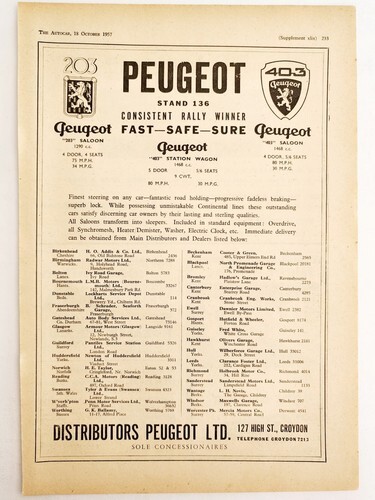 1957 Peugot Saloons Wagon Cryodon Import Advertisement Autocar Automobilia DWPP1