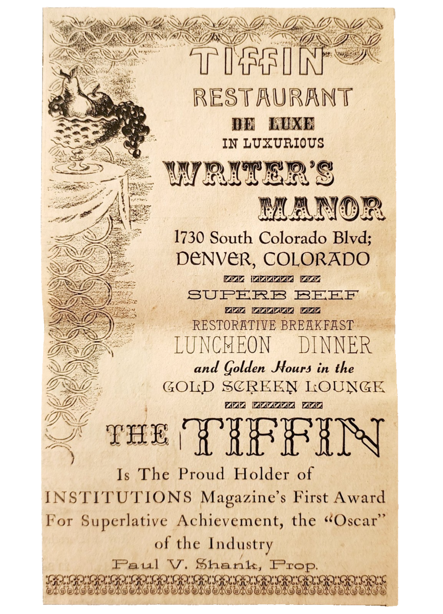 1957 Tiffin Restaurant Writer's Manor Hotel Advertisement Vintage Denver DWYY7B