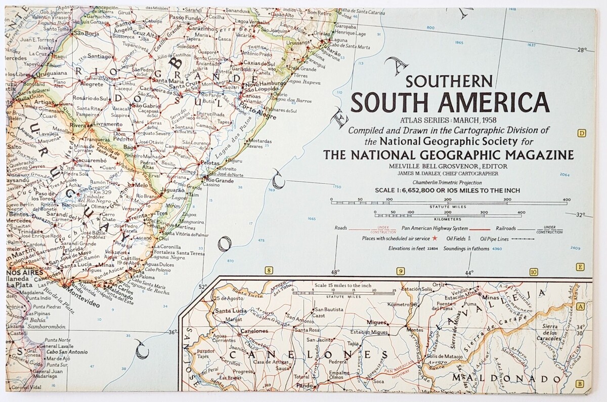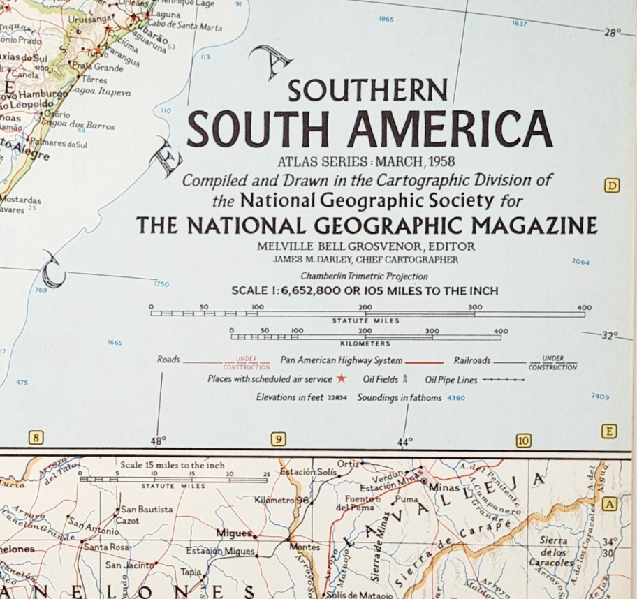 - 1958 Southern South America Map National Geographic Argentina 24.75 x 19" F13G