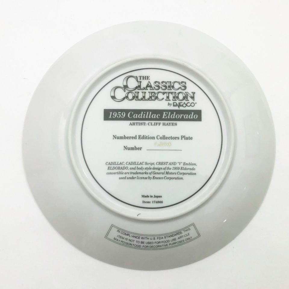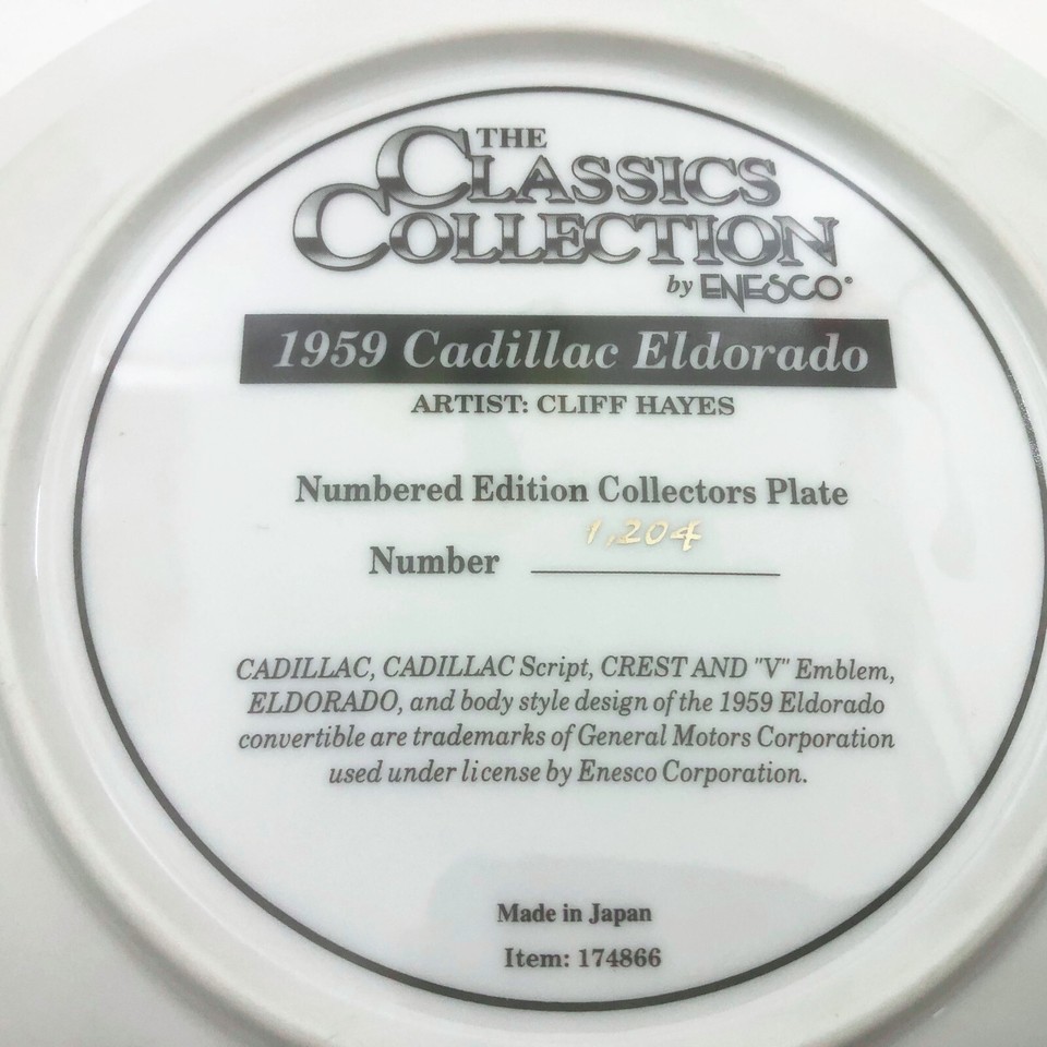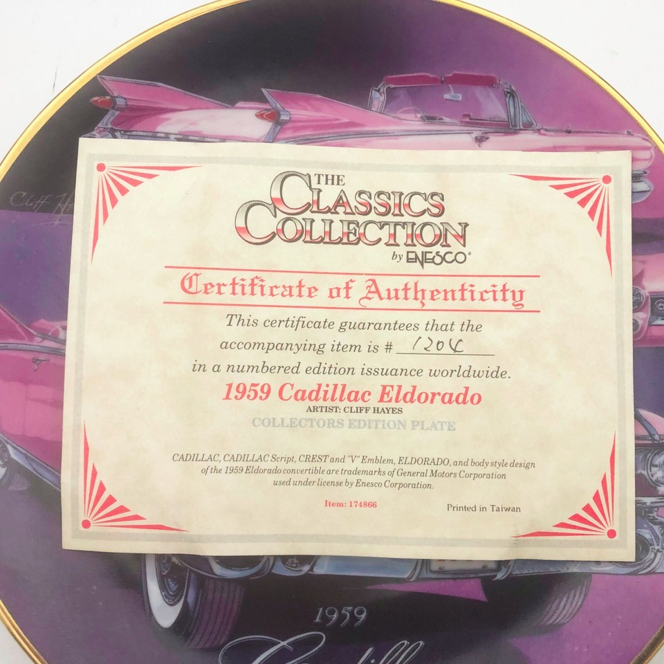 This is an EUC Enesco 1959 Pink Cadillac Eldorado collectors plate with it's certificate of authenticity. It is signed by the artist, Cliff Hayes and is a numbered edition of 1204. This collectors plate is part of the Enesco The Classic Collection. A great gift for the collectable car enthusiast. A great piece of car history. No chips, or cracks. Made in Japan Gold trim 1959 Pink Cadillac Eldorado Signed by the artist Cliff Hayes Plate # 1204 With certificate of authenticity SKU DD-4-10-2-017 Yes, we combine orders for shipping whenever possible. If did not combine the shipping on your order correctly when we combine the packages and check the shipping, if it is less than the shipping charges that you paid, we will issue you a refund for the difference.