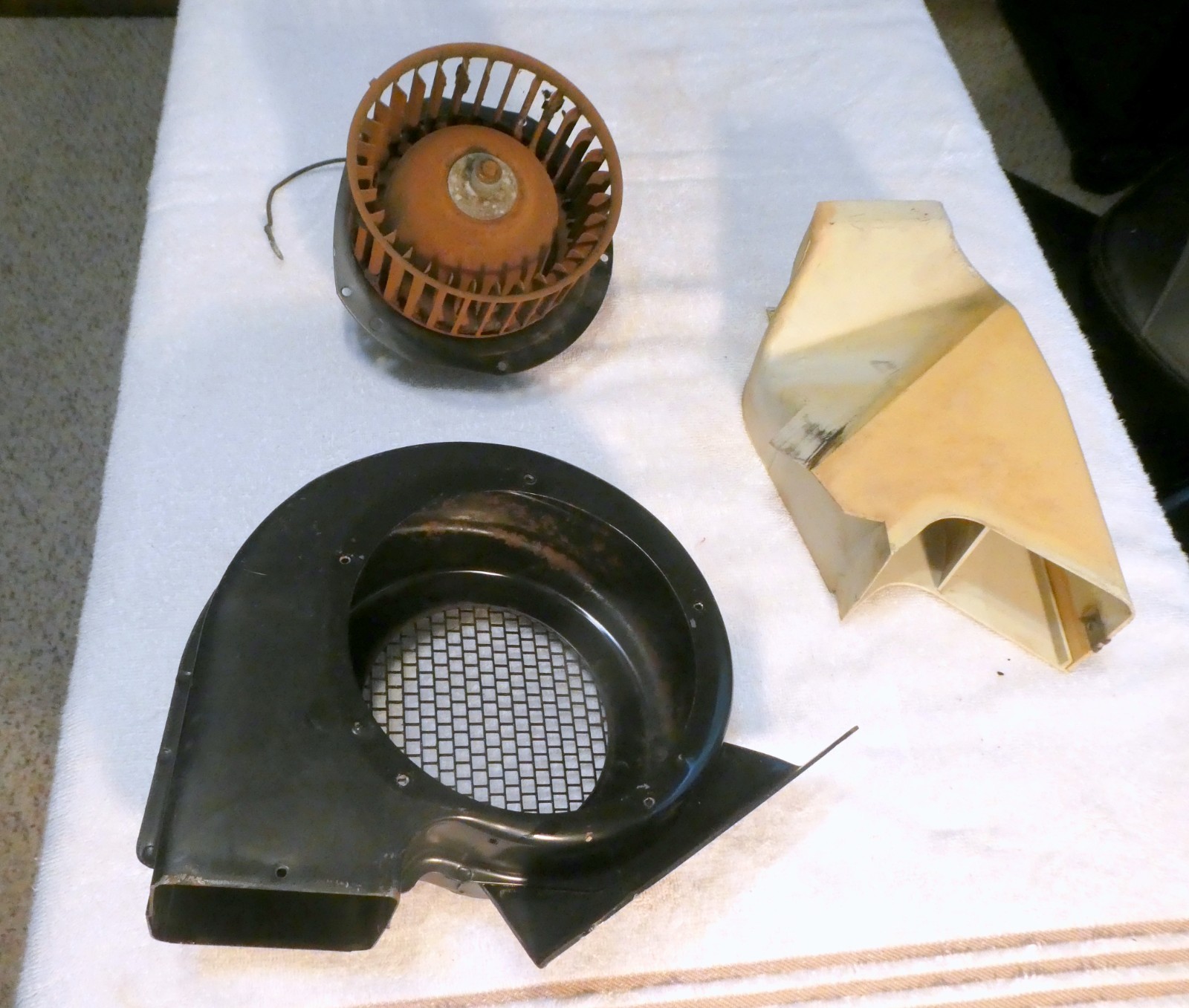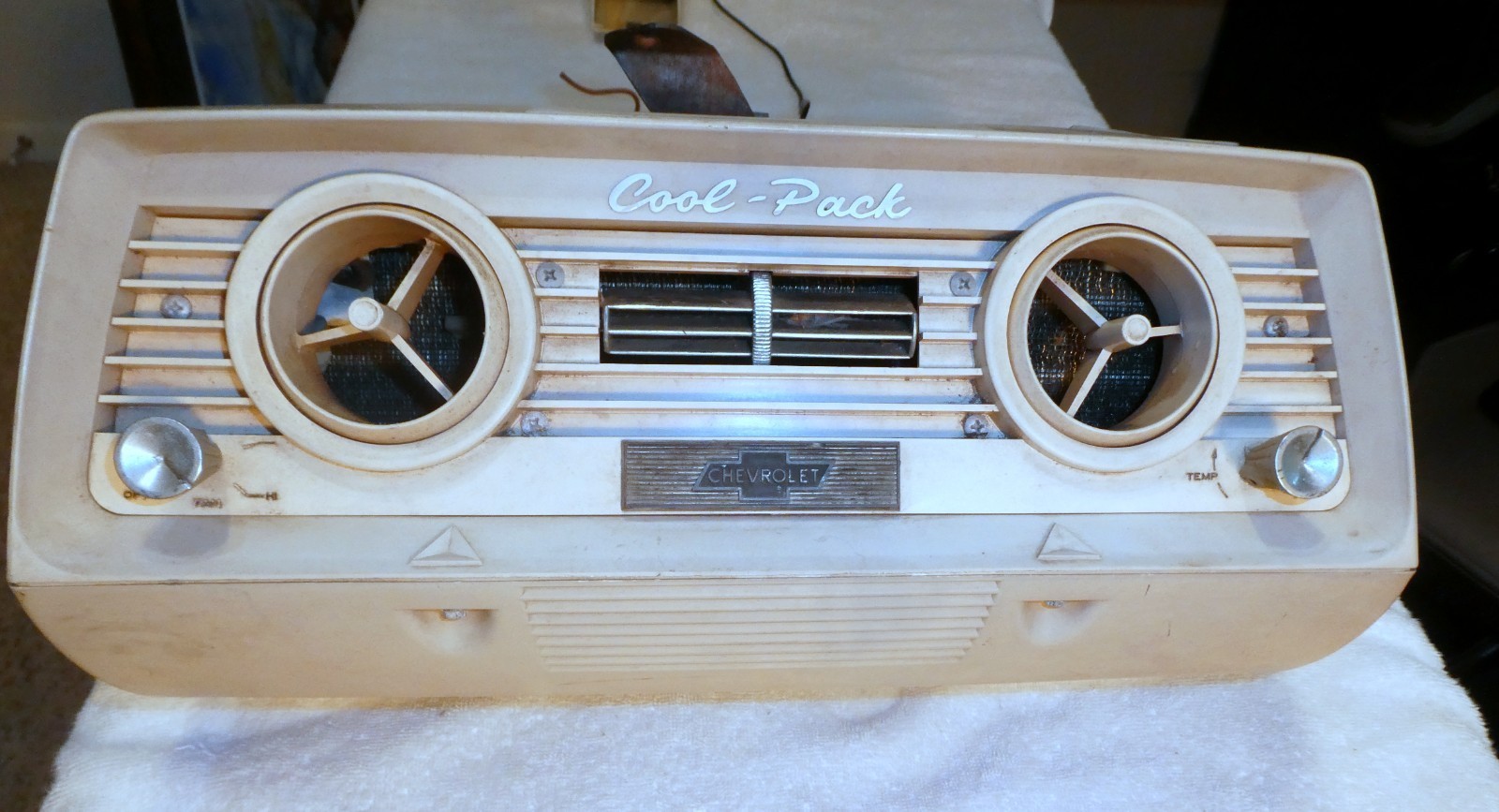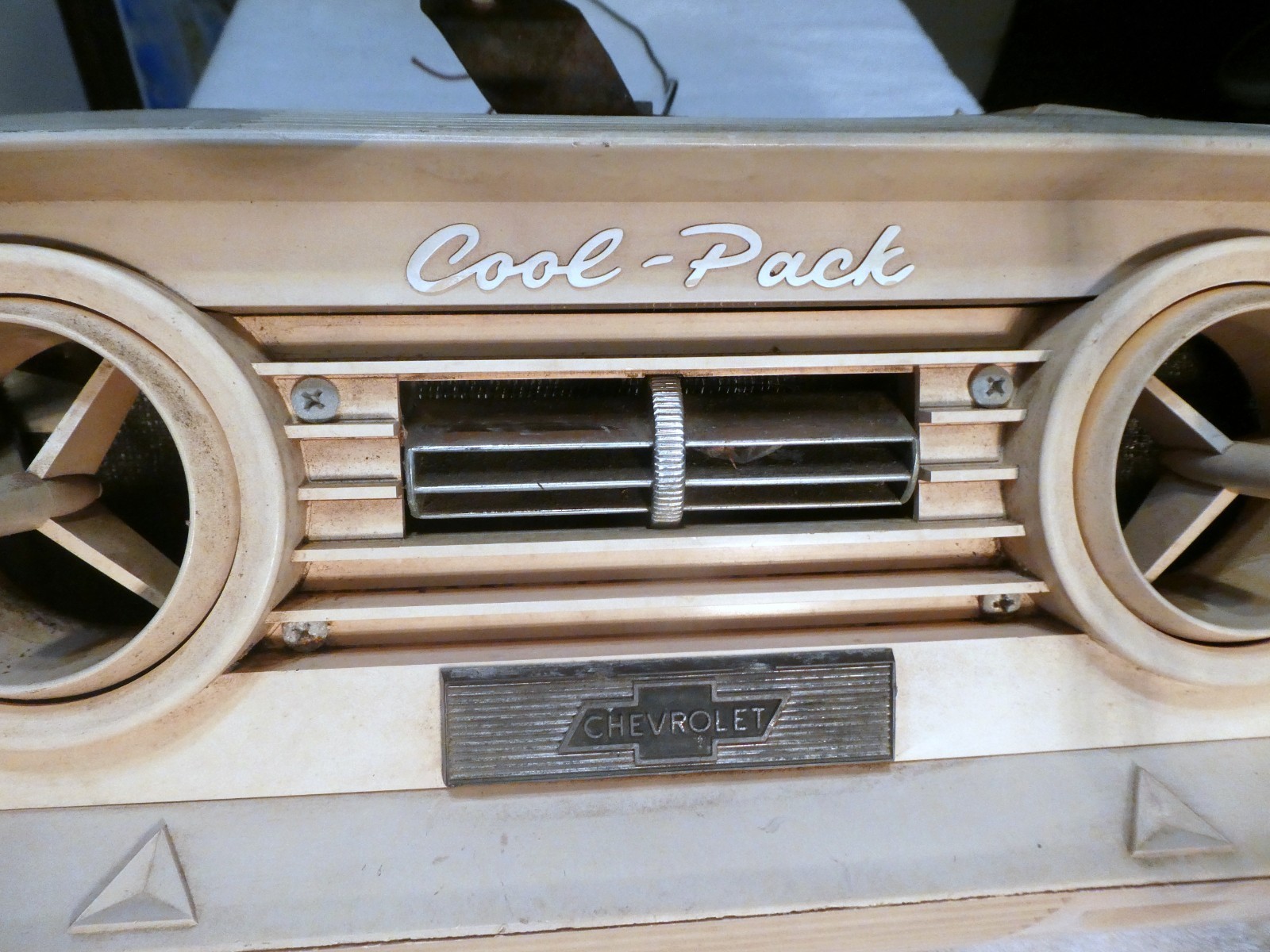 Nice 1960-1963 Chevrolet Cool Pack AC with Blower Motor. Includes the fan motor, fan Housing Squirrel Cage and the plastic AC duct. No cracks or breaks that I can see, fan motor has been tested and works fine. The AC temp and fan knobs turn mechanically not sure about the electrical function of the switches; they may or may not work properly. The evaporator core has not been tested for leaks, but it looks as though it's in good condition. The front and side vents rotate and adjust as they should. One of the side vents is missing as shown in the pictures.