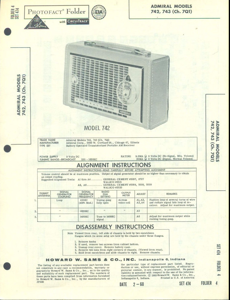1960 Photofact 4-page Folder ADMIRAL transistor radio model 742 743