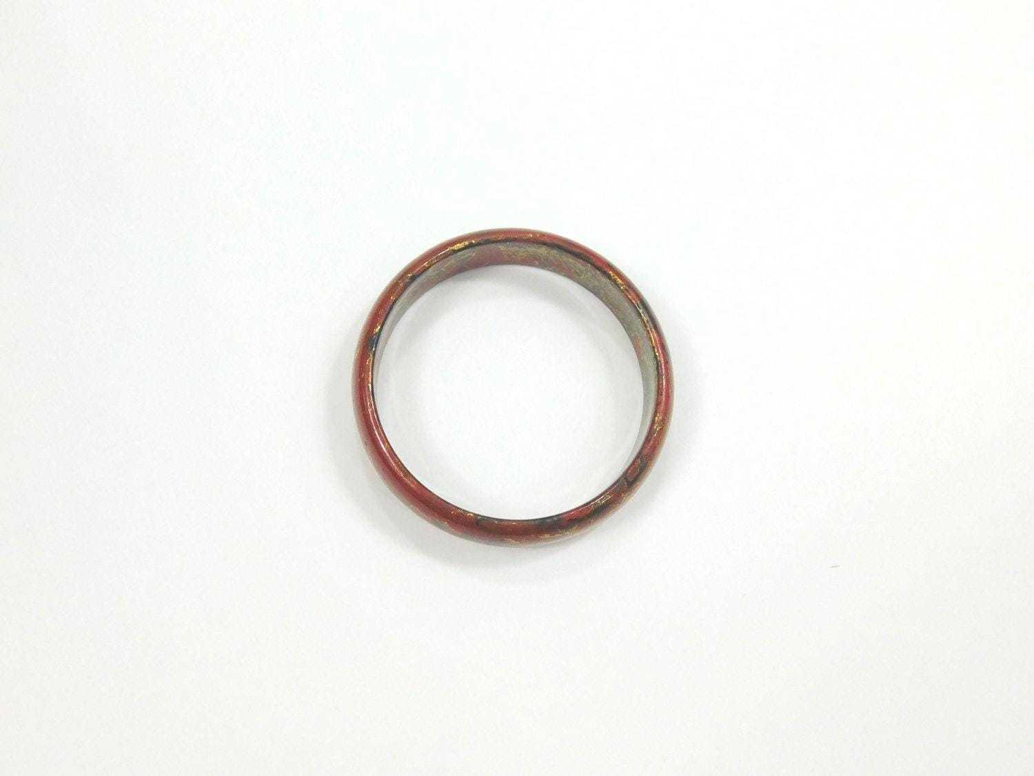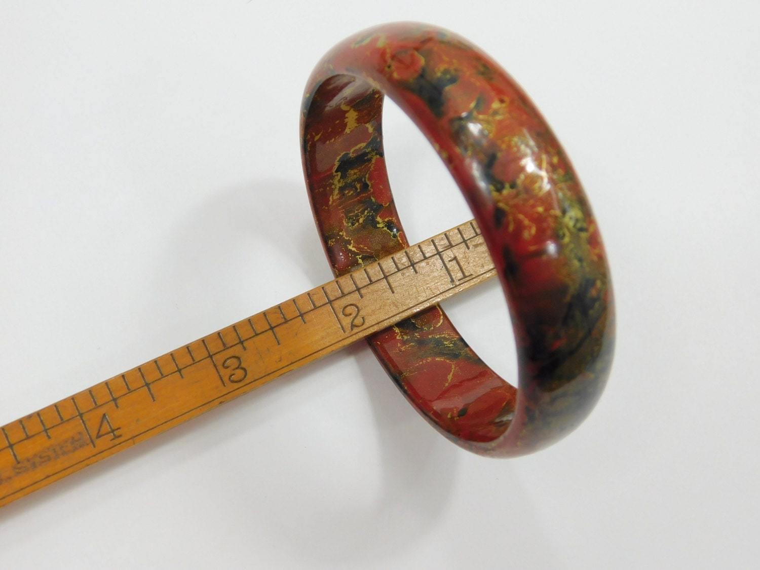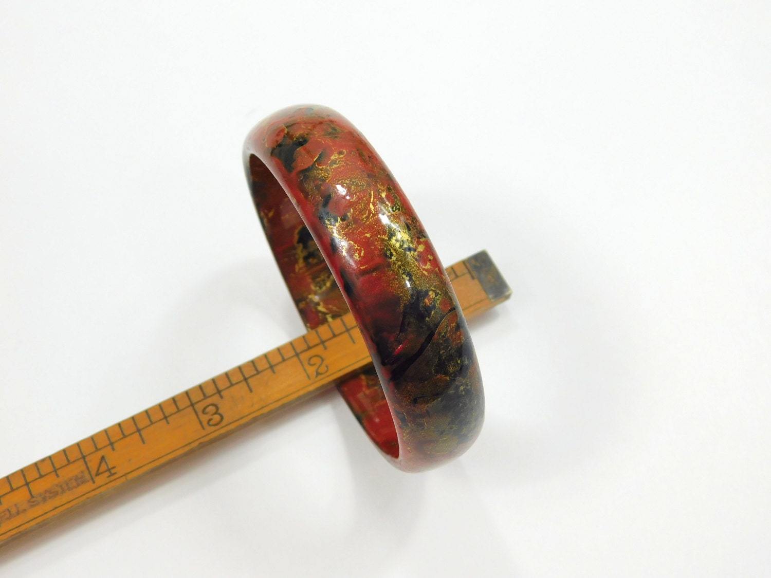 ?Style/Features: Single pour seamless cast, bold 1960s mod vibe with marbled red lucite swirling black veins suspended gold fleck inclusions, perfect to stack for everyday retro vibes