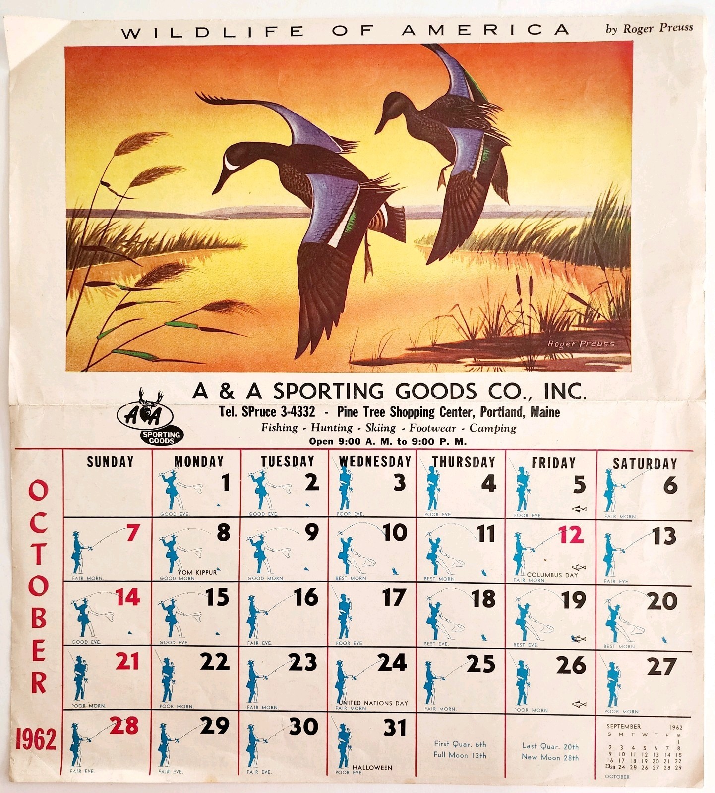 1962 A & A Sporting Goods Co October Calendar Page Maine Pine Tree Center DWJJ4