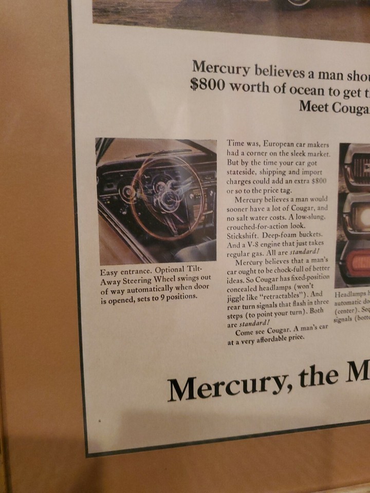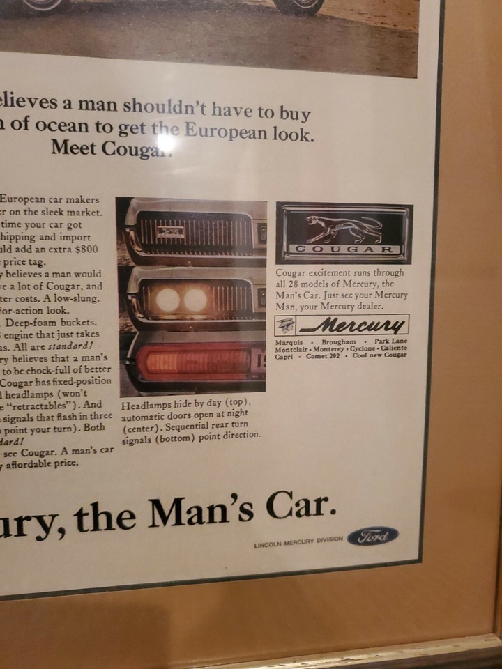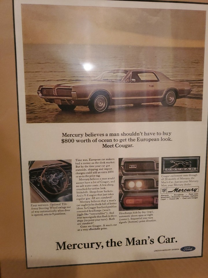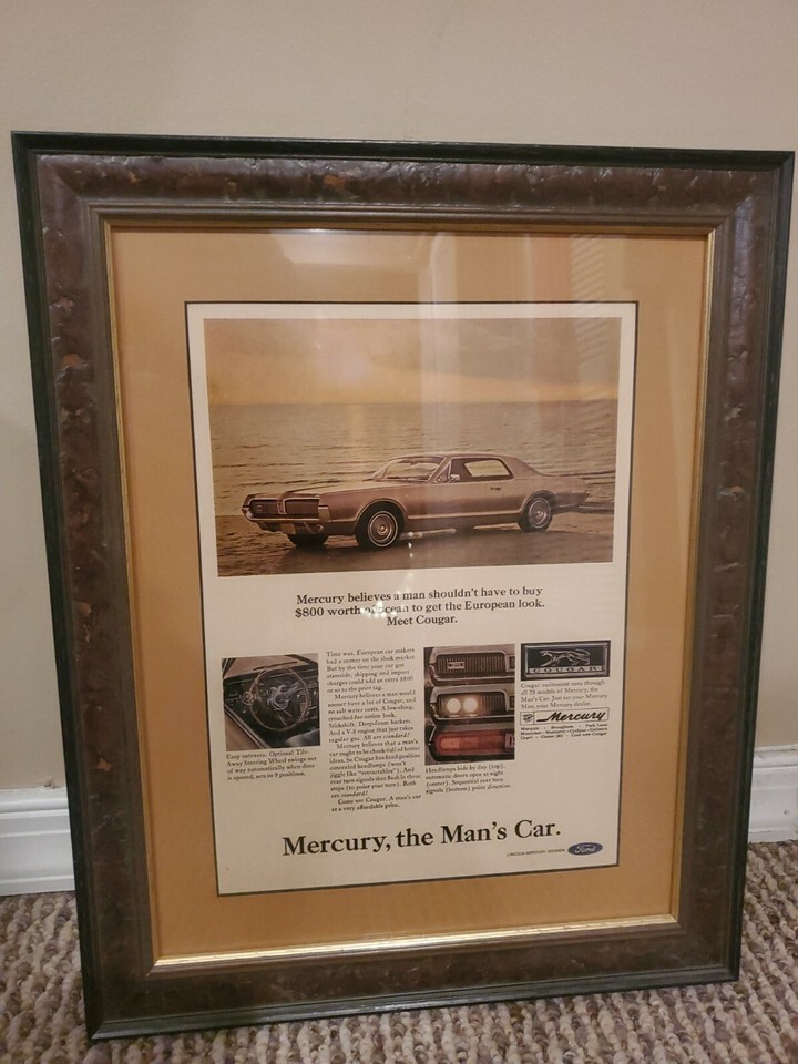 - 1967 Mercury Cougar Car Ad "The Man's Car" Framed Art 12'' x 15''