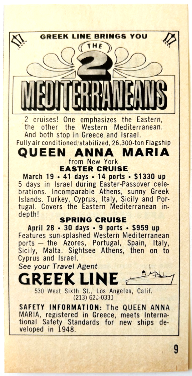 1968 Greek Mediterranean Cruise Lines Advertisement Queen Anna Maria F6M