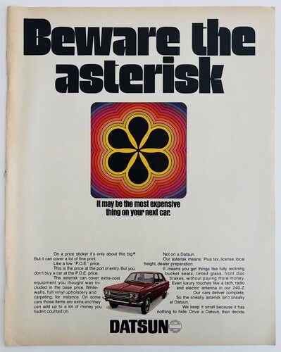 Primary image for 1970 Nissan Datsun Asterisk Car POE Prices Advertisement Automobilia DWII17