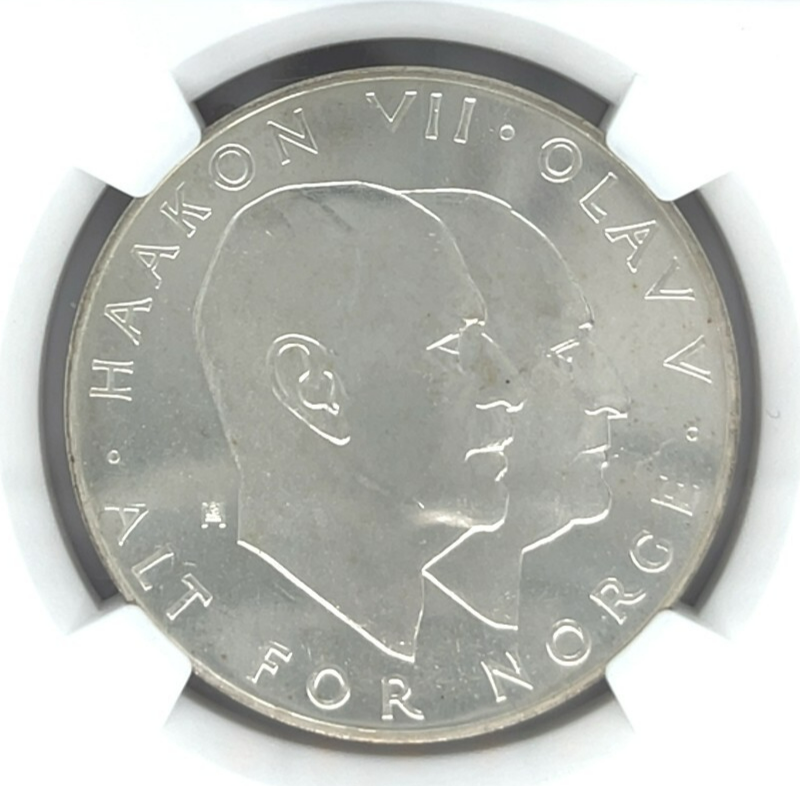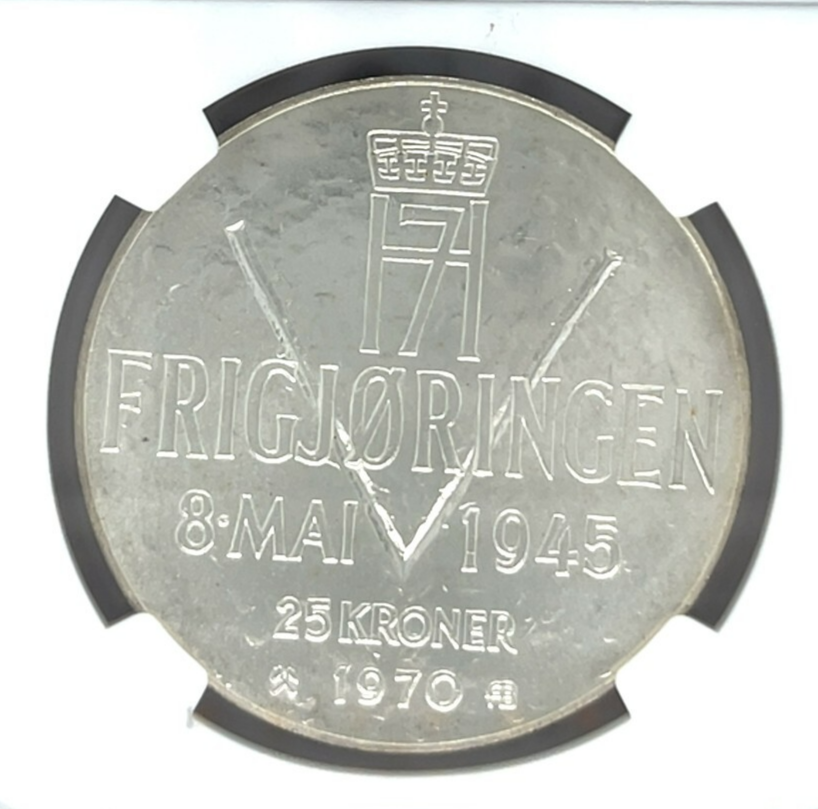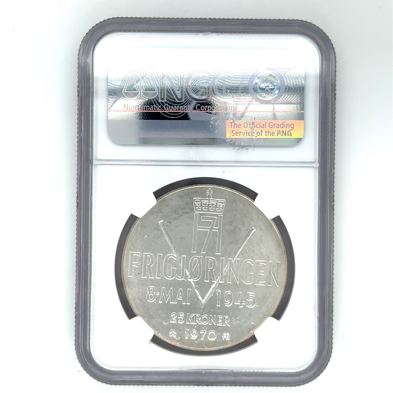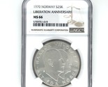 - 1970 Norway Silver 25 Kroner Liberation Anniversary Coin Graded MS 66 by NGC