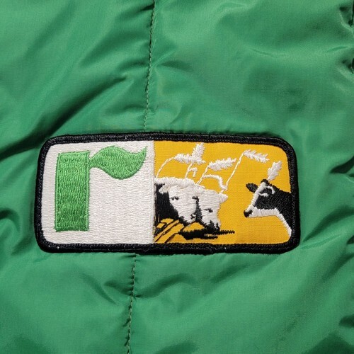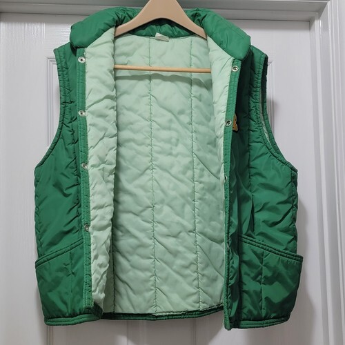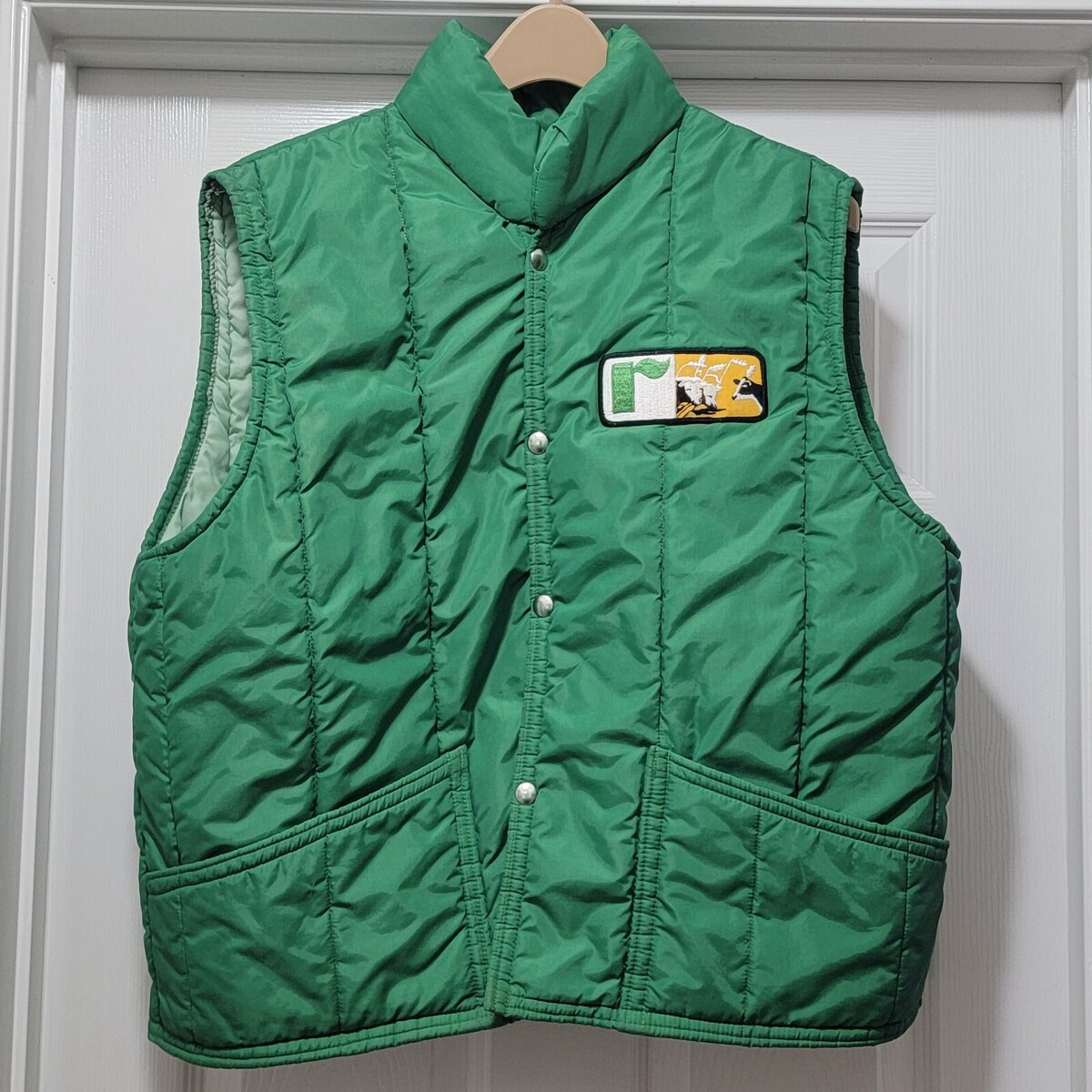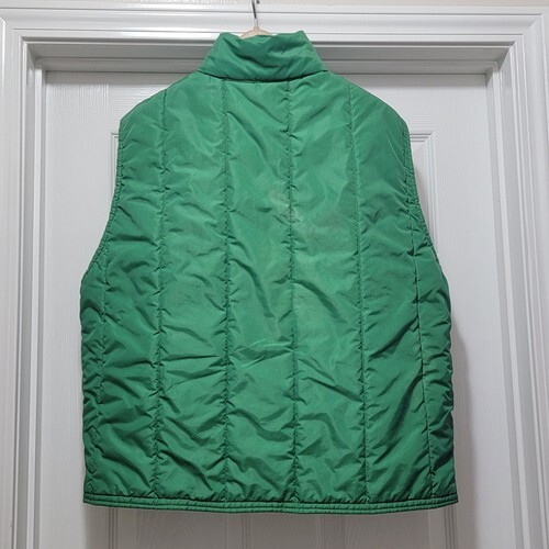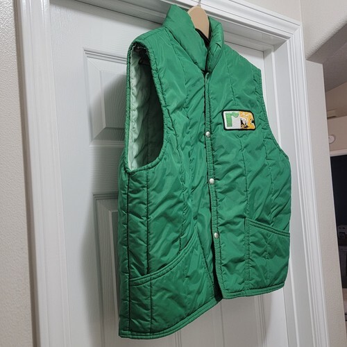 Excellent Condition Vintage 70s American Farmers Two-tone Green Nylon Puffer Vest Feed Seed Dairy Cow. Men's Size Large. Actual measurements: 49" chest, 27.5" length. Beautiful Condition! SMOKE FREE HOME! SUPER FAST SHIPPING!