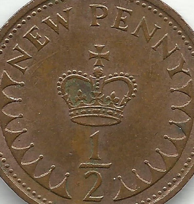 Reverse depicts St Edward's Crown, flanked by "HALF NEW PENNY" and the