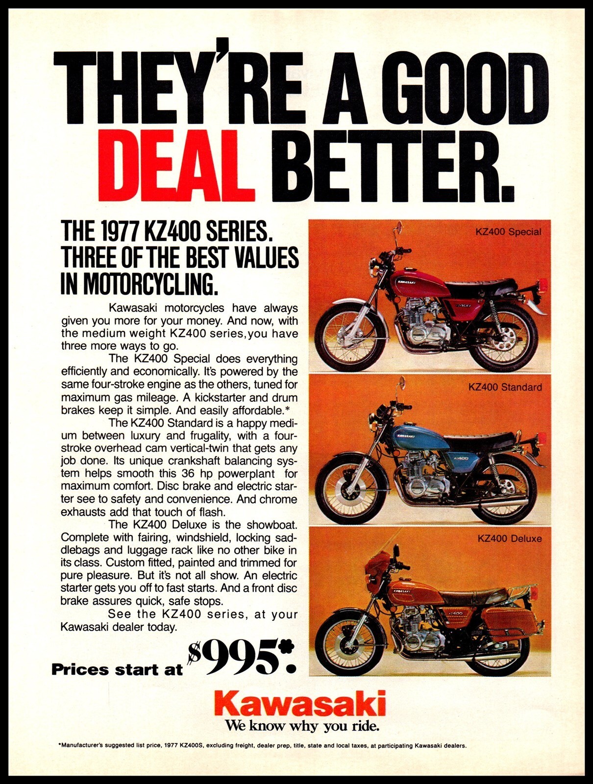 1977 Magazine Motorcycle Print Ad - Kawasaki KZ400 Special, Standard, Deluxe A6