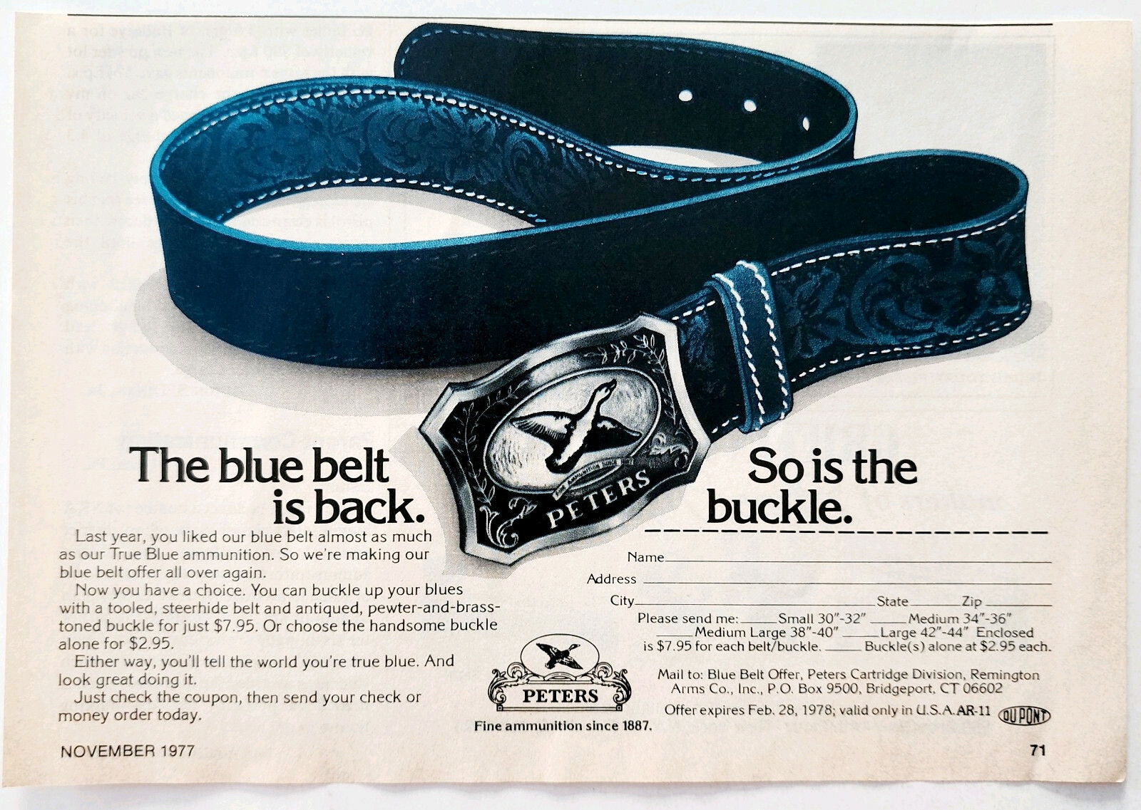 1977 Peter's Ammunition True Blue Belt Advertisement Hunting Clothing DWQQ4