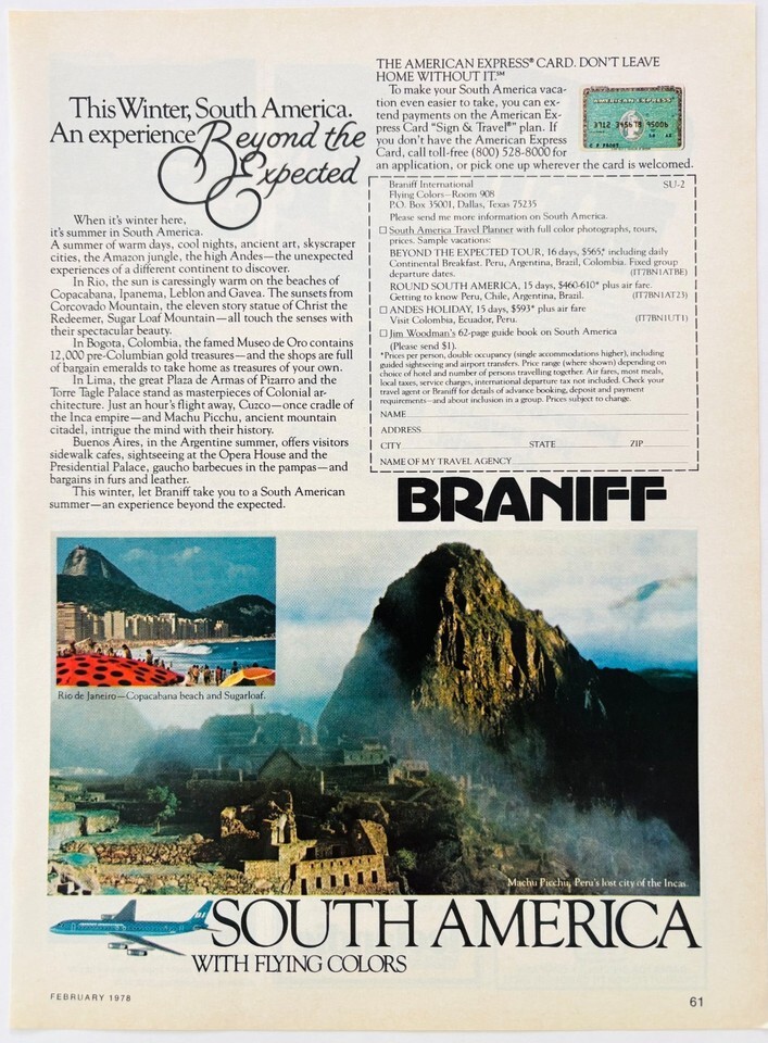 1978 Braniff Airlines Advertisement Vintage Aviation South America DWW12E