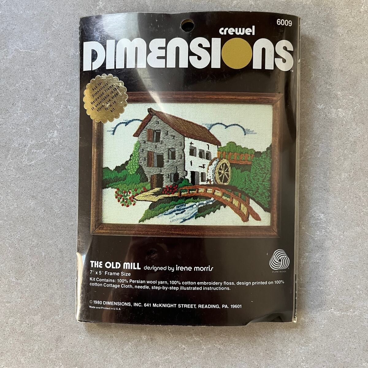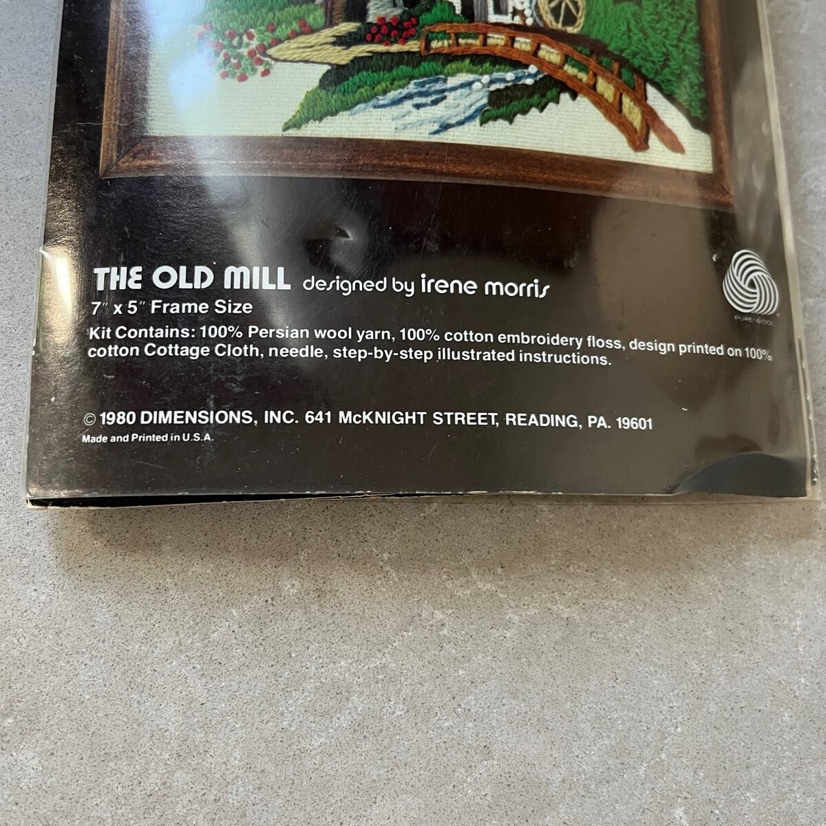 Vintage 1980 Dimensions Crewel "The Old Mill" kit #6009. Complete in sealed package. Designed by Irene Morris Fits at 7" x 5" frame