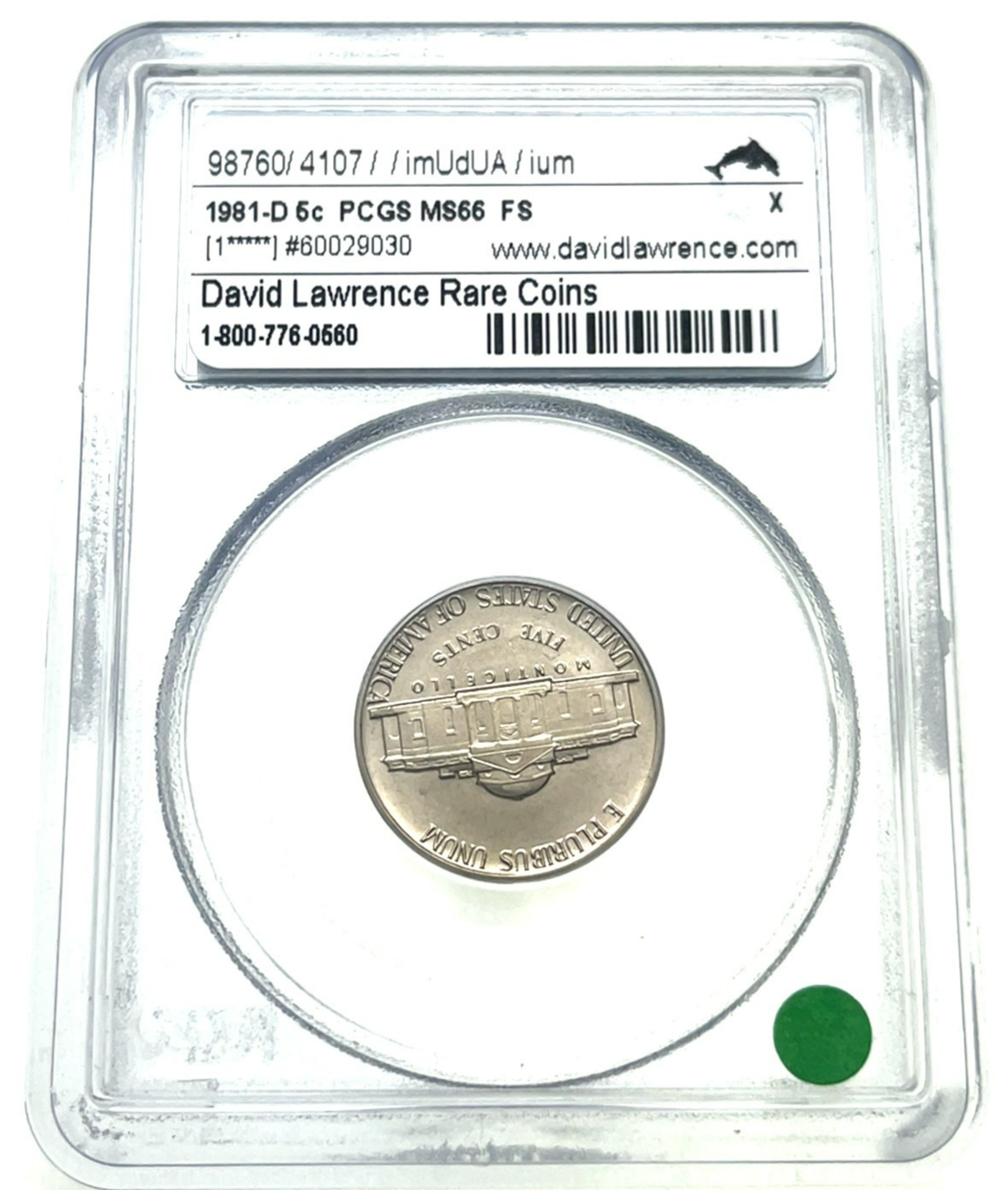- 1981-D 5C Jefferson Nickel Graded by PCGS as MS66FS Full Steps Uncirculated