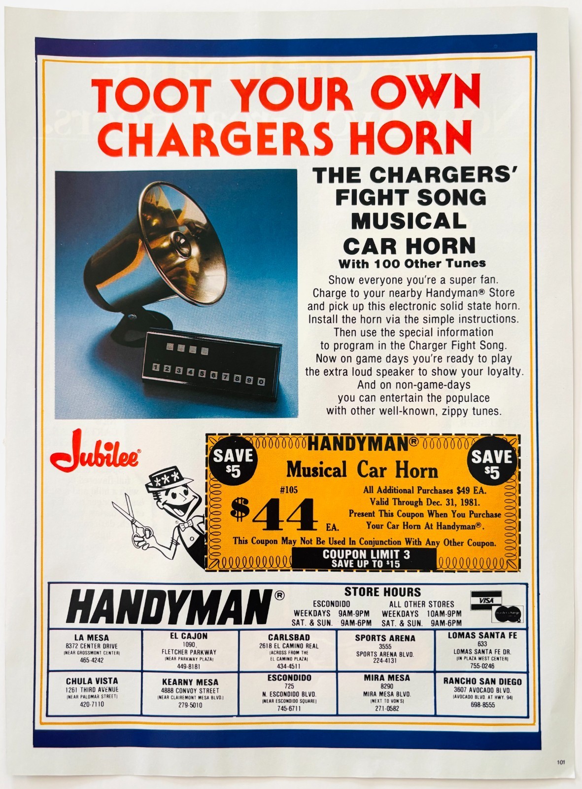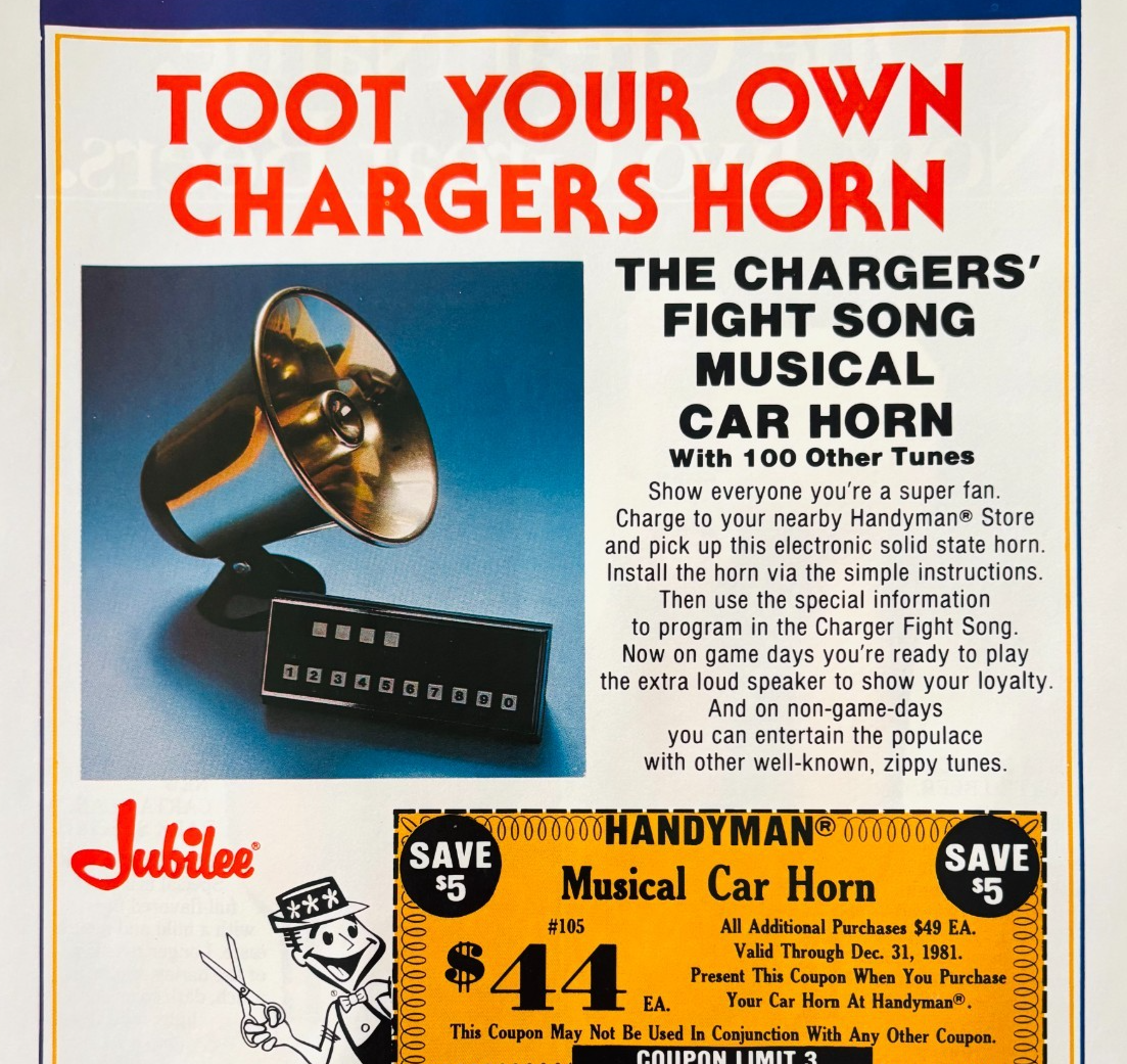 1981 Handyman Store Advertisement Vintage San Diego Chargers Car Horn DWV11B