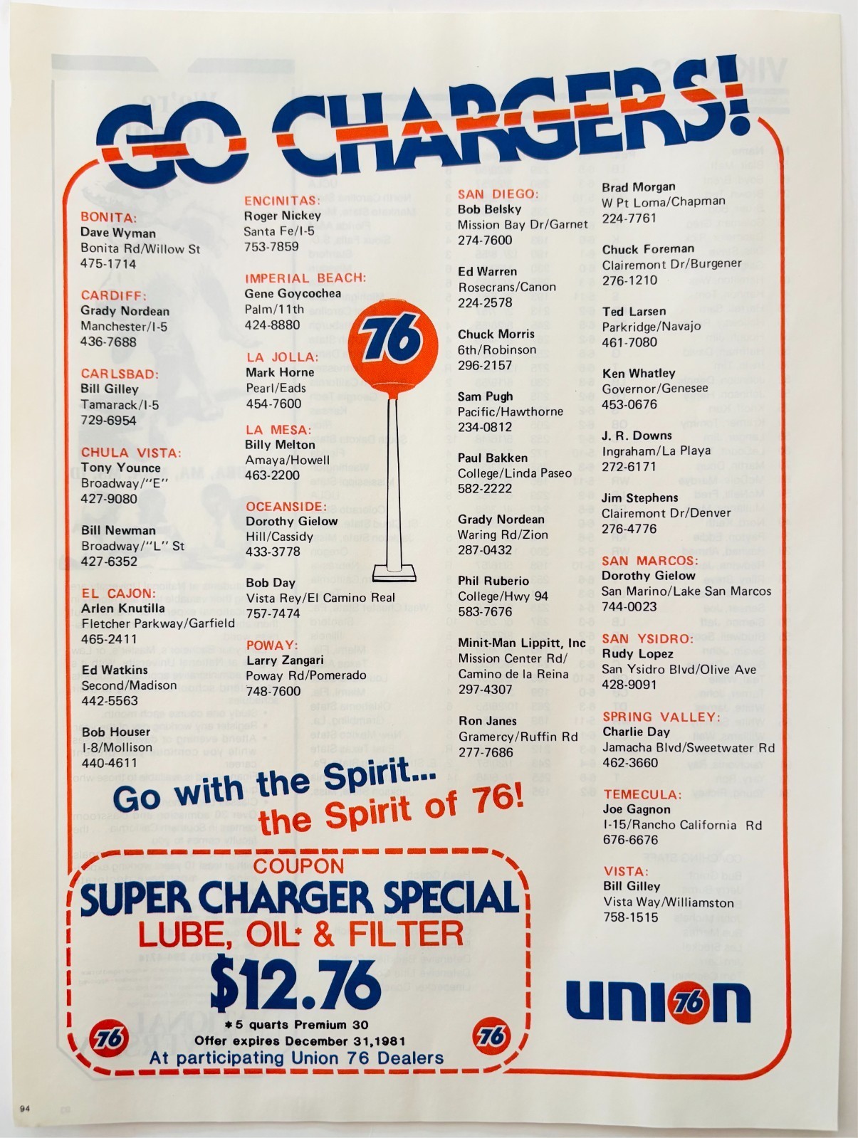 1981 Union 76 Oil San Diego Chargers Advertisement Vintage NFL Football DWV11A