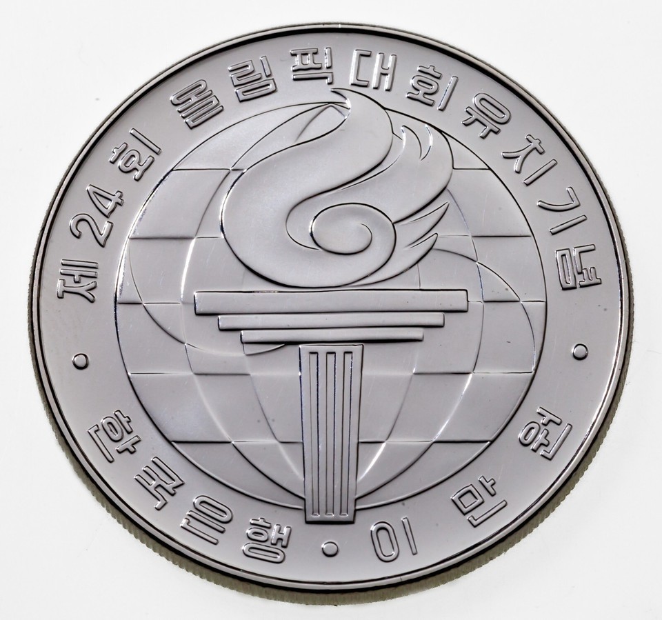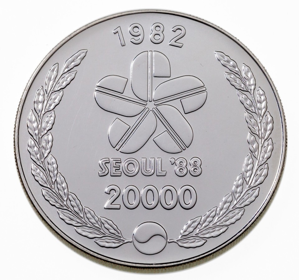 - 1982 South Korea 20000 Won Silver Coin, Seoul '88 Unfrosted Proof KM 30