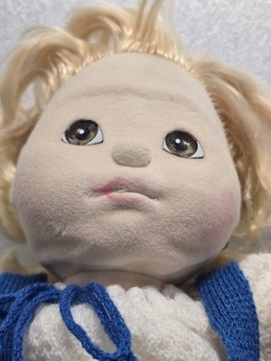 The 1985 Mattel My Child Doll with Hazel Eyes and Blonde Hair is a vintage collectible featuring a girl doll with curly hair and a light complexion. This original doll from the 1980s comes with a handmade outfit, including hair accessories, shoes, socks, and tights. Made of cloth, this doll is 13 1/2 inches tall and depicts the character "My Child." It is a single unit and is perfect for collectors or fans of vintage dolls.