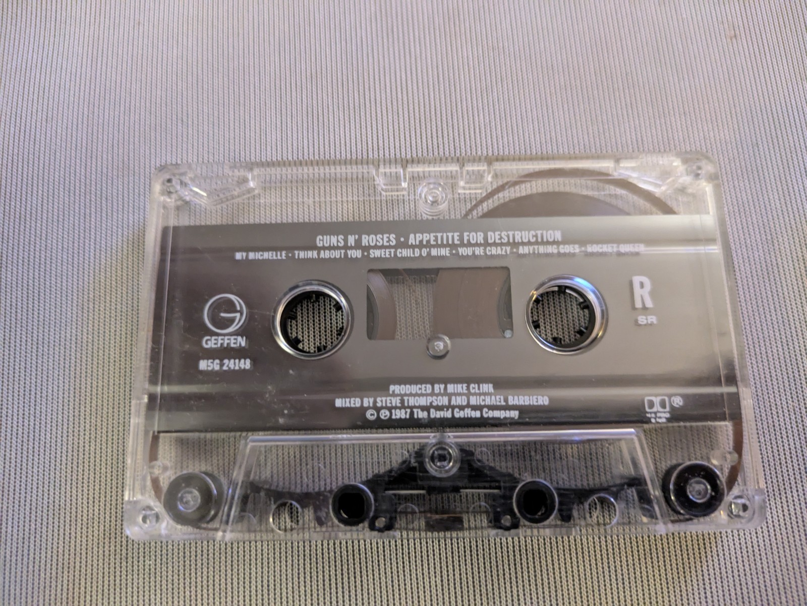 L'audiocassetta dei Guns N' Roses Appetite for Destruction del 1987 e la prima edizione dell'album in una custodia trasparente, contenente musica hard rock prodotta da Mike Clink. Questo album, pubblicato da Geffen, e un must per i fan del rock 'n' roll e della musica in lingua inglese degli anni '80. Con la custodia interna originale inclusa, questa cassetta e un pezzo nostalgico che cattura il suono e lo stile iconici dei Guns N' Roses di quell'epoca.
