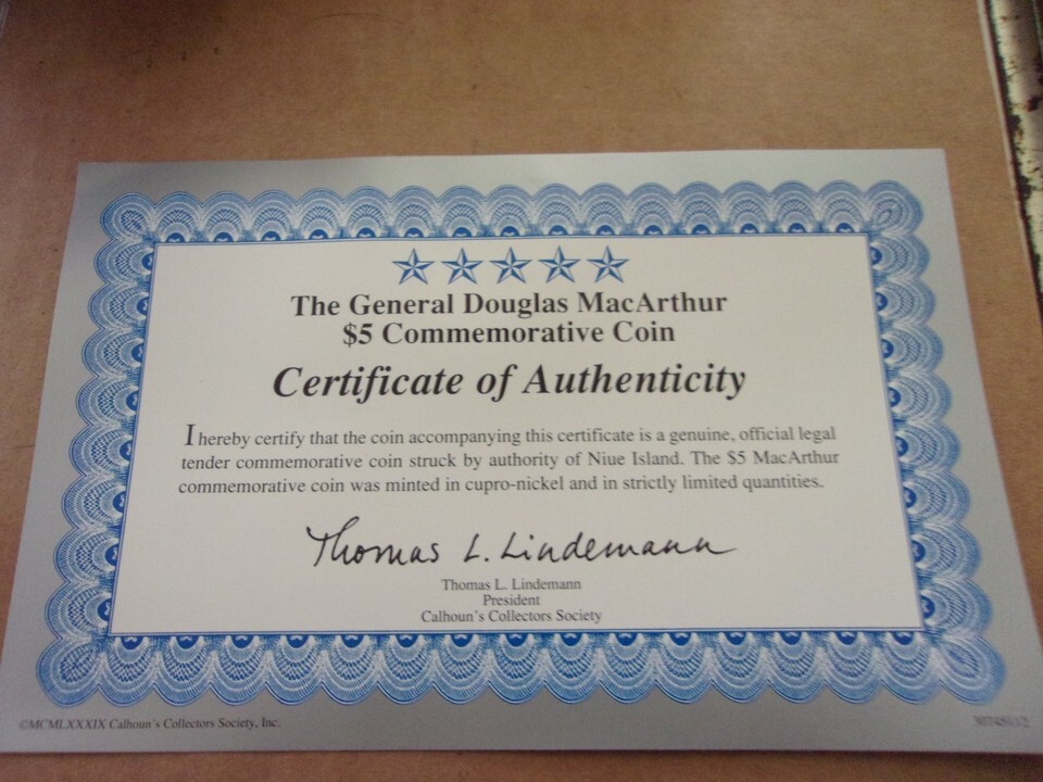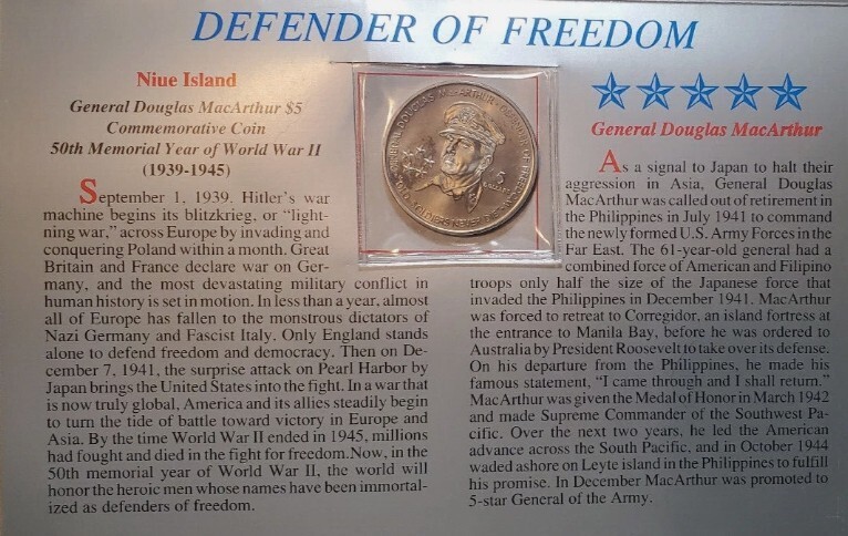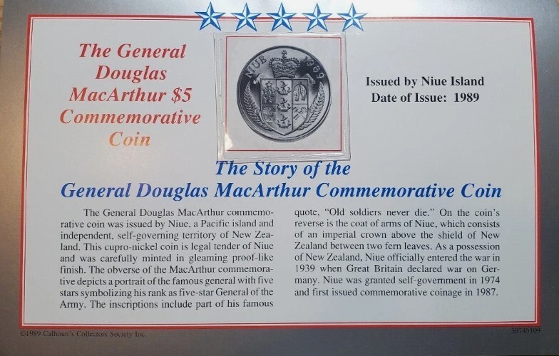 - 1989 5 Dollar Coin General Douglas MacArthur Commemorative Niue Island