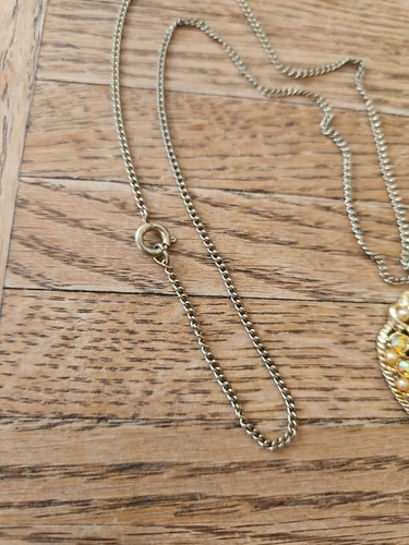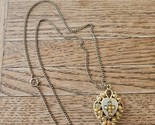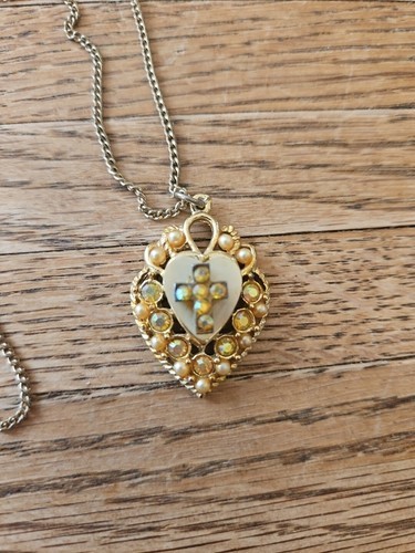 Roughly 19'' long, adjustable with clasp. Pendant is heart shape with cross. Gold tone; pendant has a pink gold tone under light.