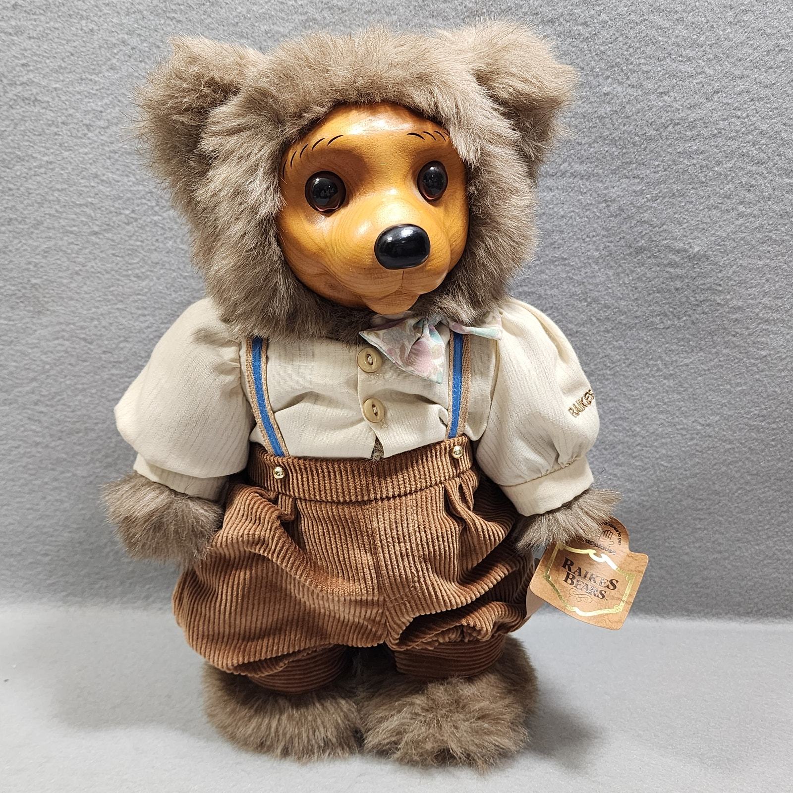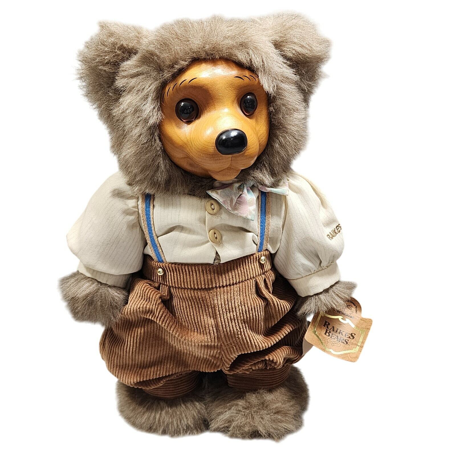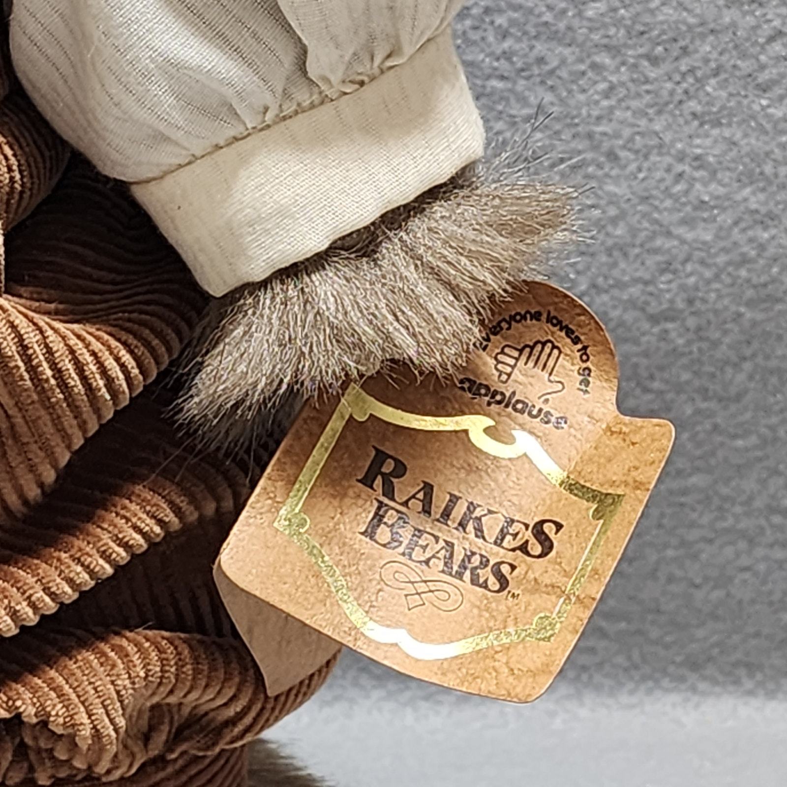 1992 Signed Robert Raikes Bear Alison Picnic Bear Carved Wooden Face Feet - With Tag. By Applause Wonderful Vintage Collectors Piece. Known for their carved wooden faces and mohair bodies. Dressed shirt, suspenders and corduroy overalls. Limited Edition. Preowned. Gently lovingly enjoyed. No visible signs of damage. Very clean condition.